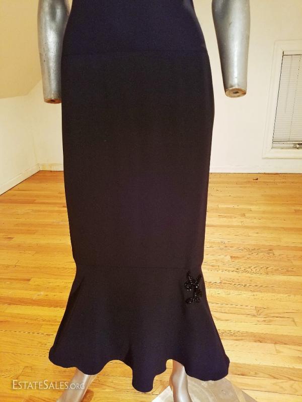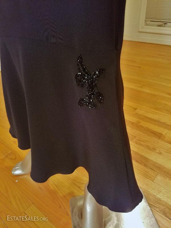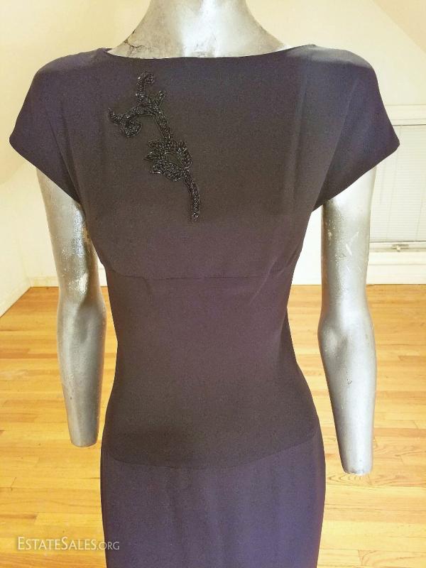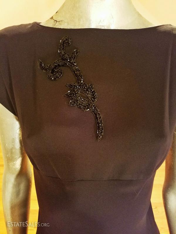 Embellished with a touch of black onyx beads at top bodice and flared skirt.. It is a stunner. In very good condition except for a tiny hairline fissure at the back that is hardly noticeable.. Pix were taken with extra bright lights to show details. The dress is a black in coloration.