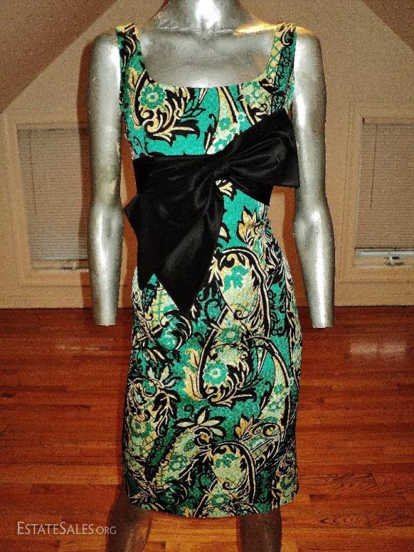 Vtg Kay Unger NY silk brocade wiggle dress Kitten bow