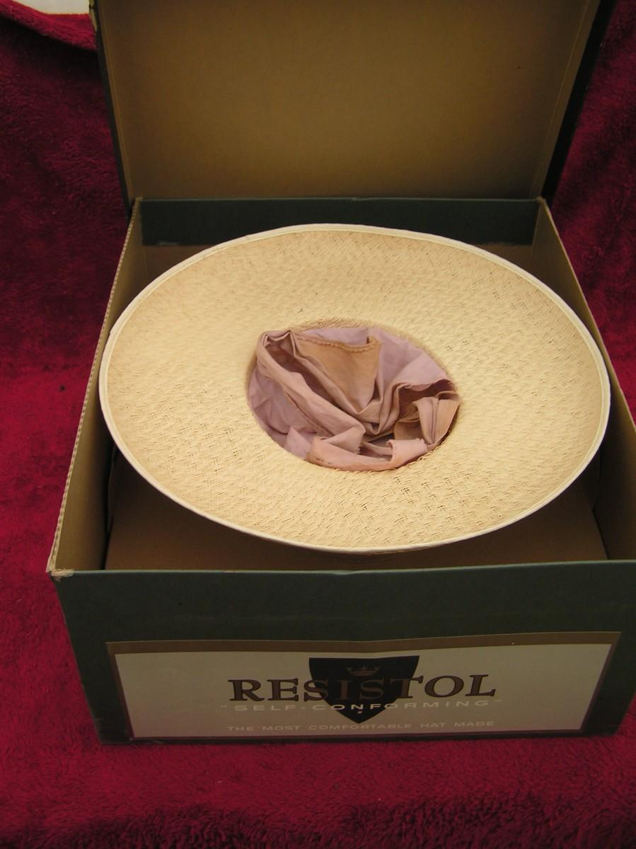 VTG Ladies summer sun hat w/ tie ribbon. In the original box. “Resistol” brand. “The most comfortable hat made” It show signs of being worn and loved, but still very nice.
