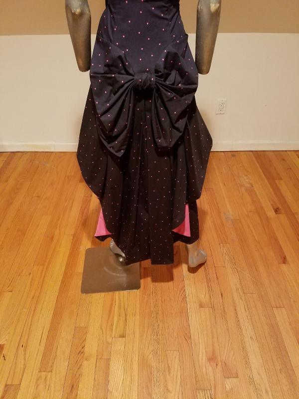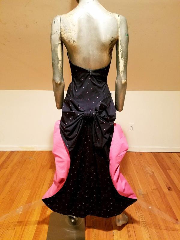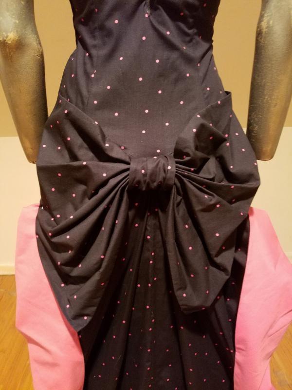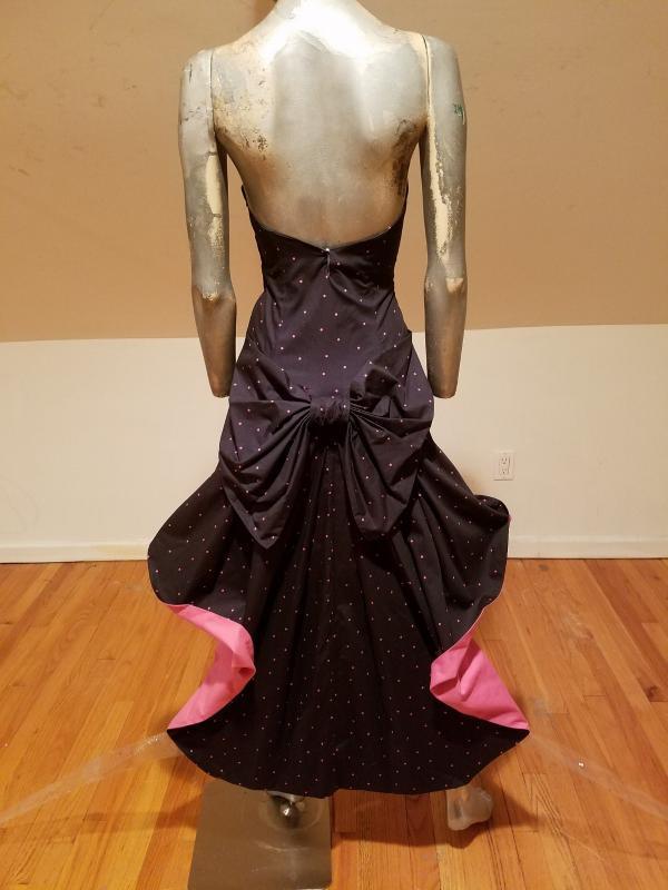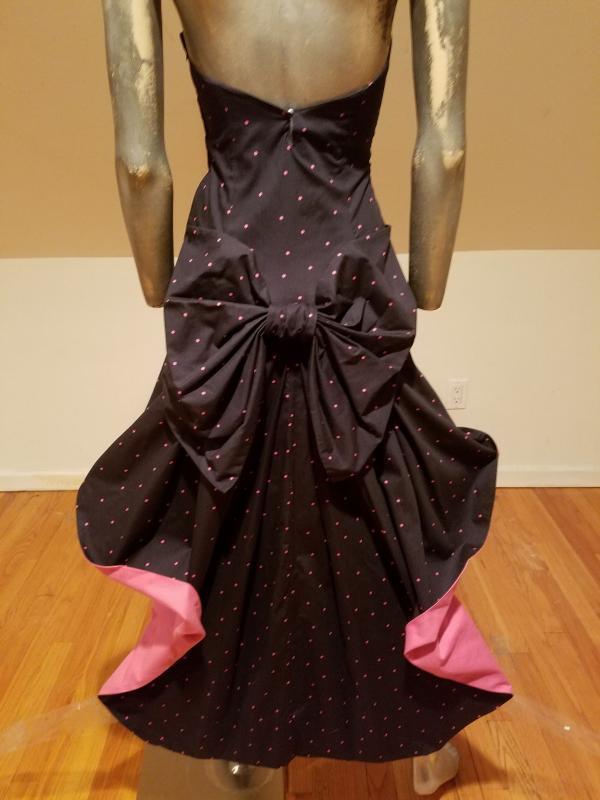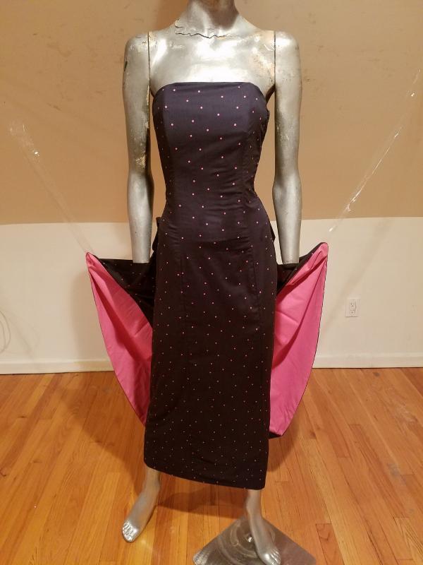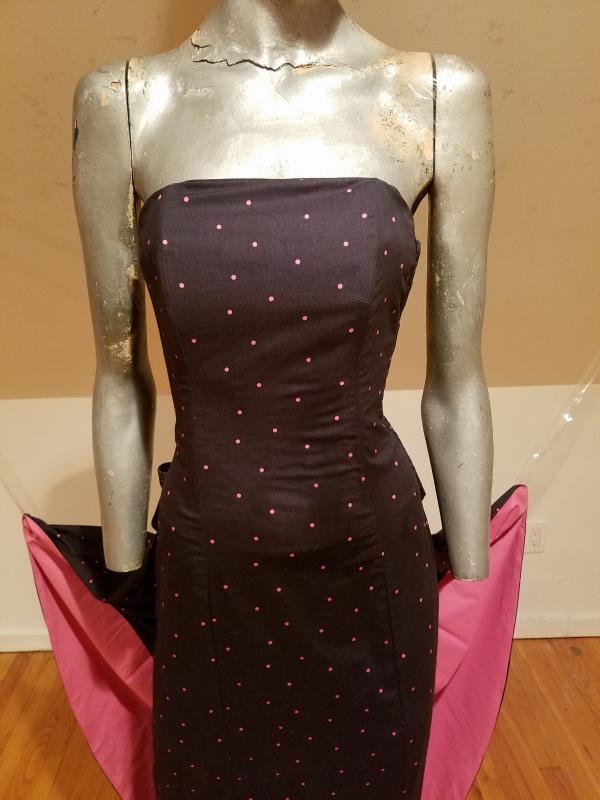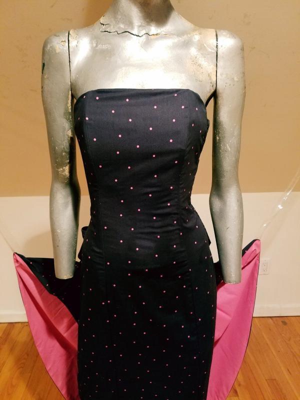 It is structured with a Basque and kitten bow with wings that are color block pink at one side polka dot on black background on the main side. The bodice has bones. Made in the United Kingdom this is a Legendary dress That cannot be had anymore.
