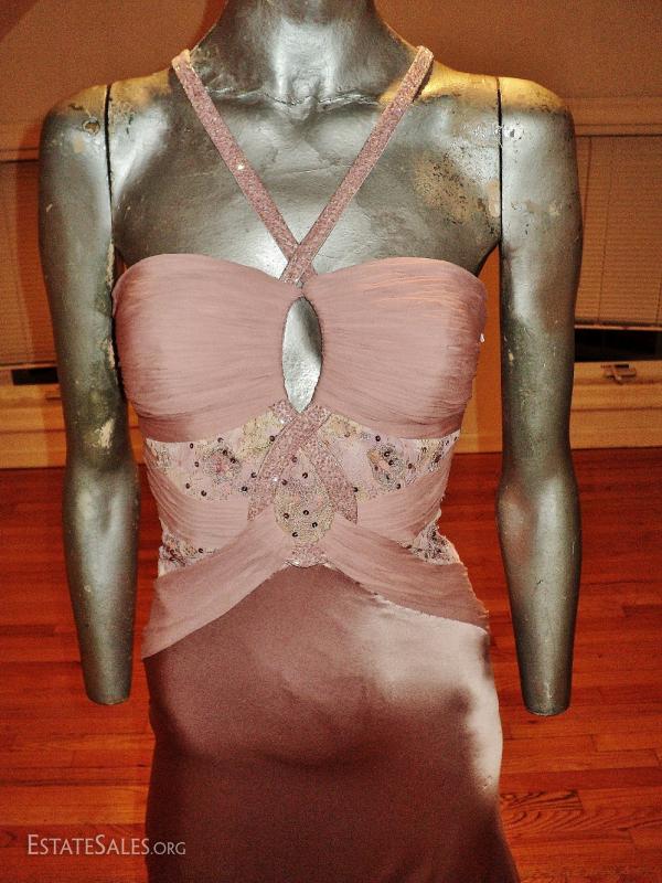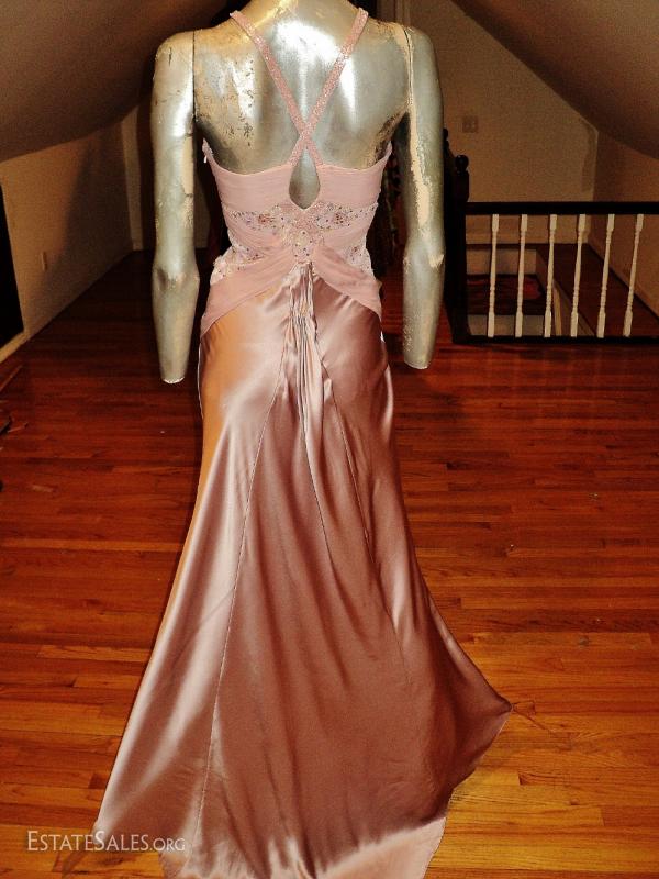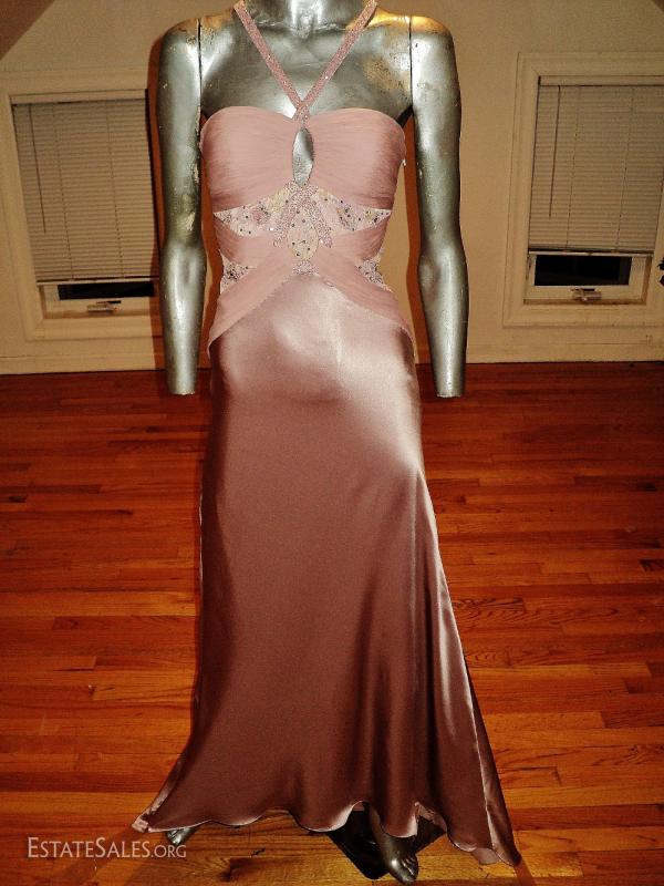 This one is a gorgeous couture designer silk gown Hollywood regency Style sequins & beads on lace shirred chiffon . Goddess style.cut on a bias