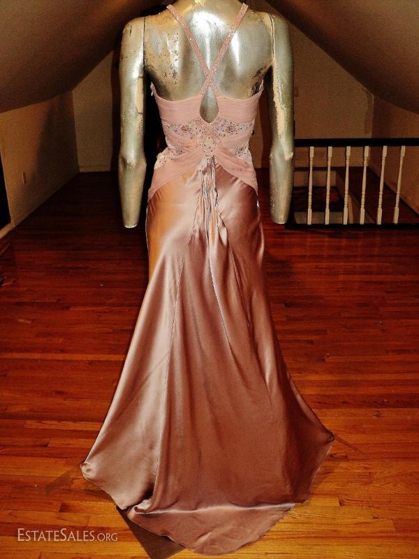 This one is a gorgeous couture designer silk gown Hollywood regency Style sequins & beads on lace shirred chiffon . Goddess style.cut on a bias