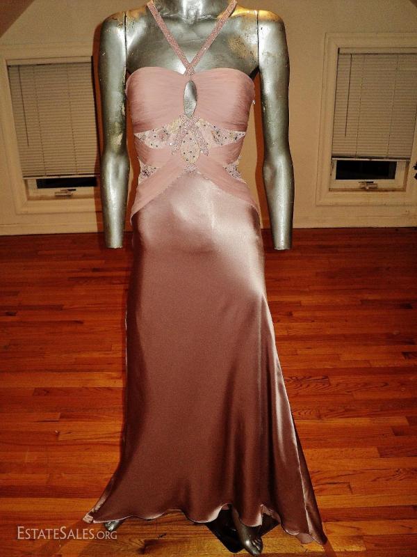 This one is a gorgeous couture designer silk gown Hollywood regency Style sequins & beads on lace shirred chiffon . Goddess style.cut on a bias