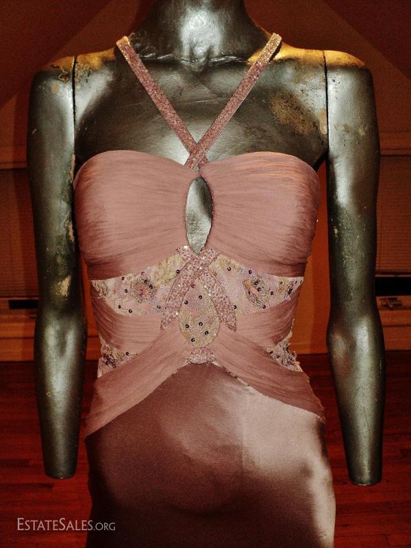 This one is a gorgeous couture designer silk gown Hollywood regency Style sequins & beads on lace shirred chiffon . Goddess style.cut on a bias