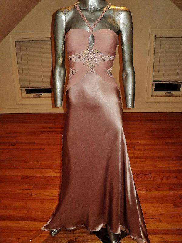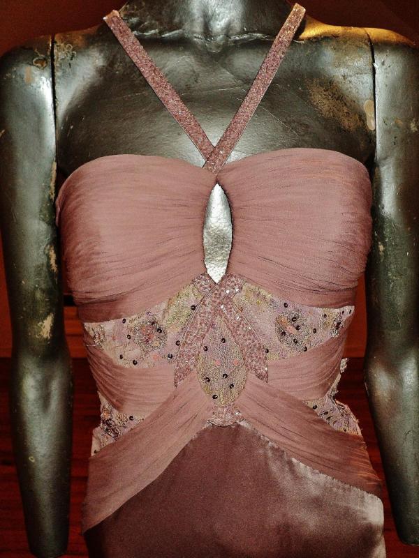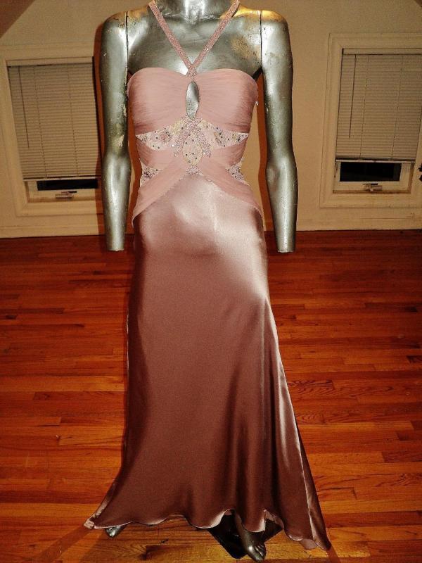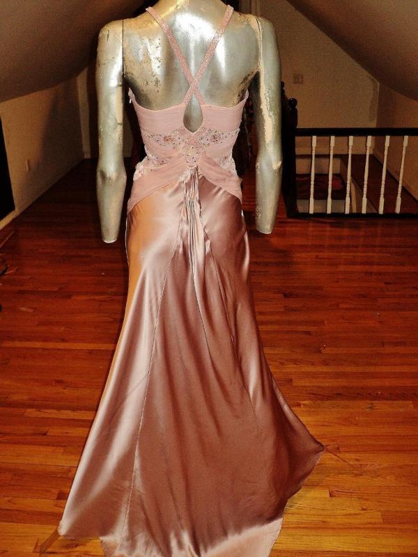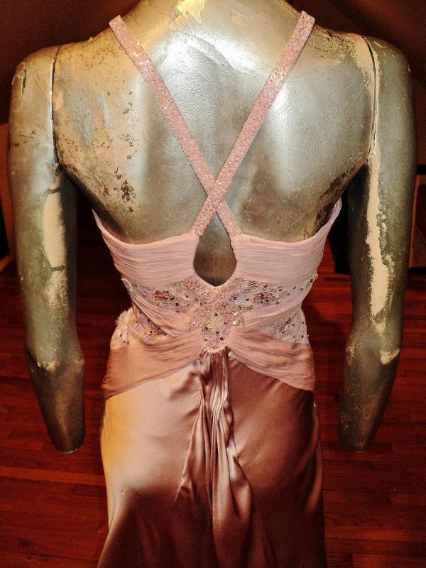 This one is a gorgeous couture designer silk gown Hollywood regency Style sequins & beads on lace shirred chiffon . Goddess style.cut on a bias