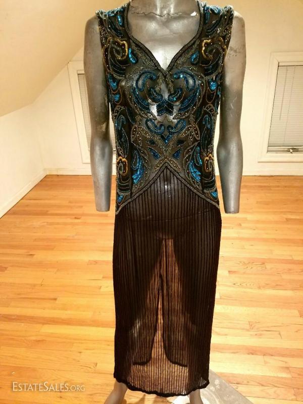 Maxi layering silk flapper long dress all embroidered with amazing design of beads sequins gold beads atop a silk chiffon in amazing condition. Back zipper