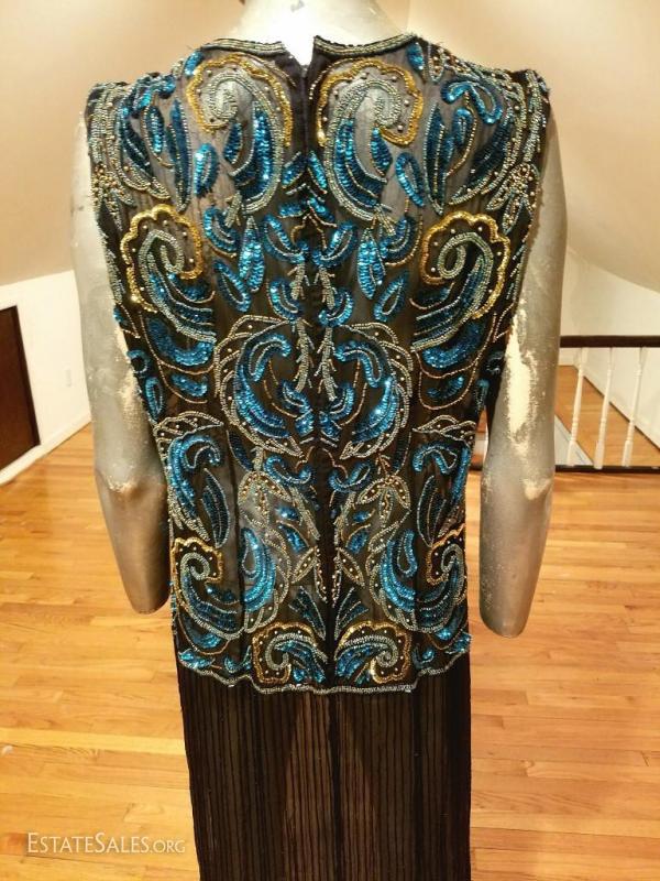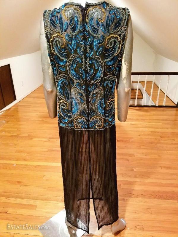 Maxi layering silk flapper long dress all embroidered with amazing design of beads sequins gold beads atop a silk chiffon in amazing condition. Back zipper