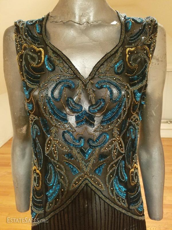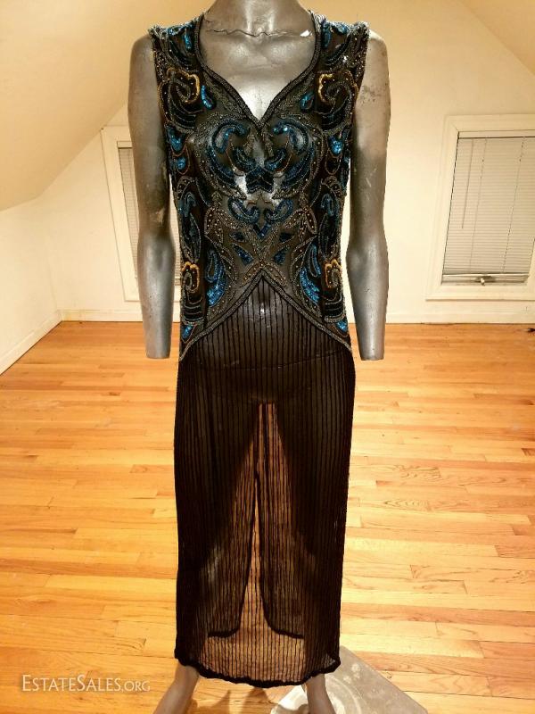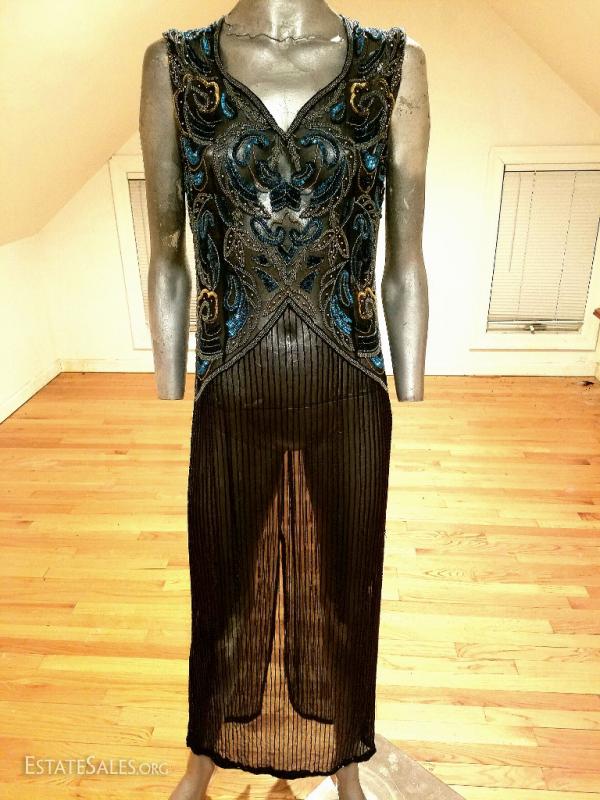 Maxi layering silk flapper long dress all embroidered with amazing design of beads sequins gold beads atop a silk chiffon in amazing condition. Back zipper