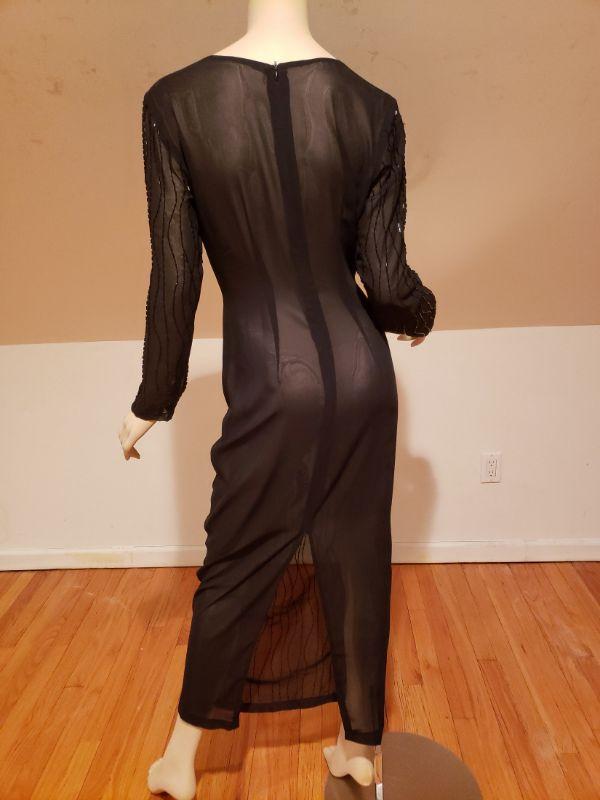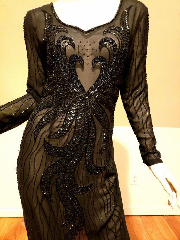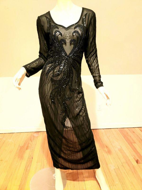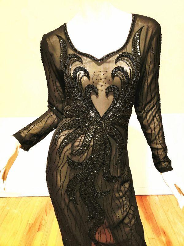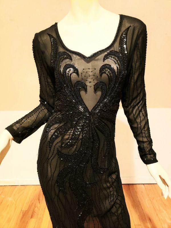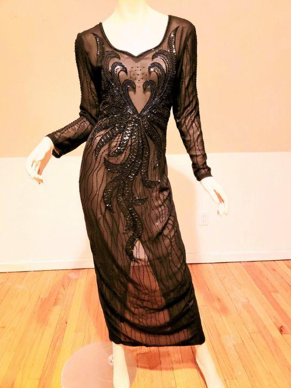 An exquisite dress with black onyx colored beads in a stunning floral design on voile.