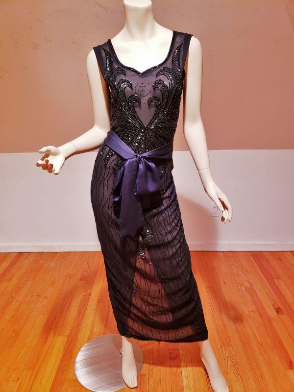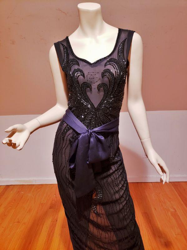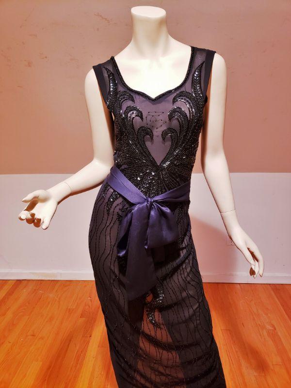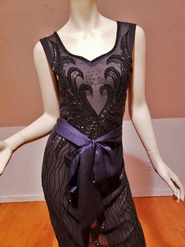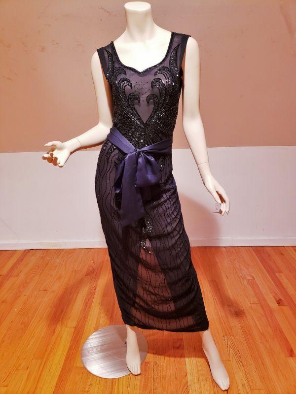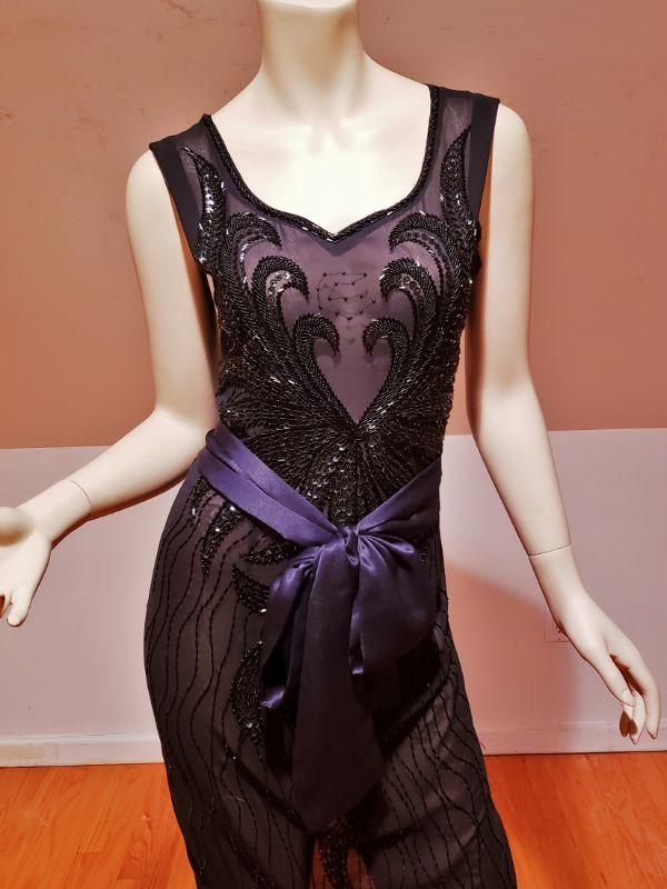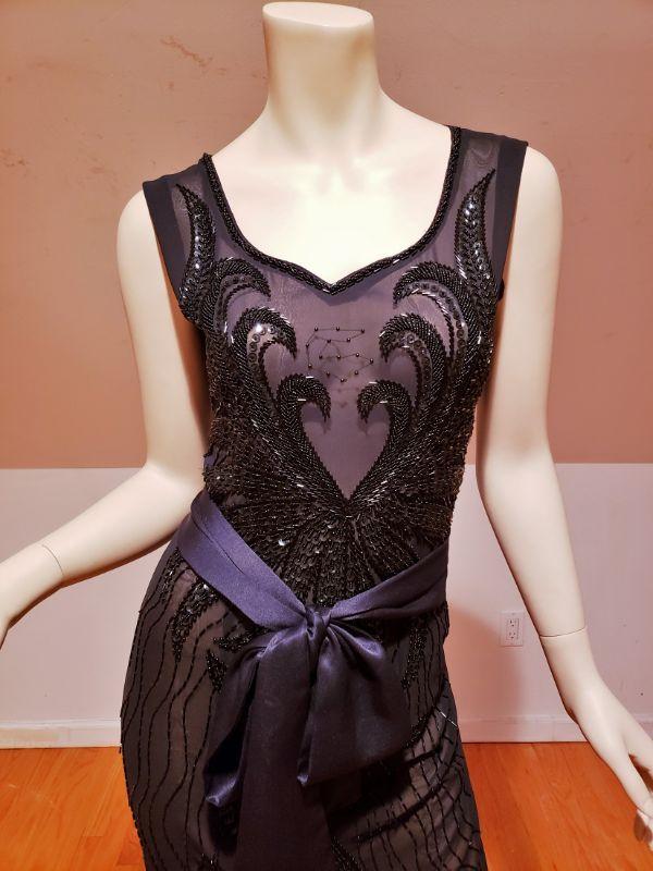 An exquisite dress with black onyx colored beads in a stunning floral design on voile.