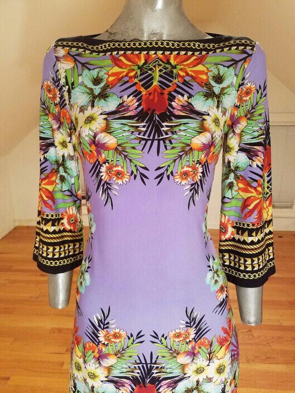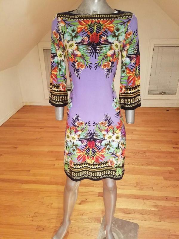 This dress is stunning. Vibrant colors and hand printed design spandex jersey content, very fluid and soft.