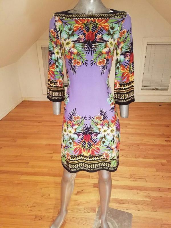 This dress is stunning. Vibrant colors and hand printed design spandex jersey content, very fluid and soft.