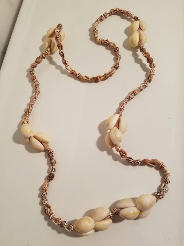 Beautifully hand made with south Pacific Sea Shells. This one can be worn in different ways that I show in the pictures or as a long strand. Very unique looking and quite rare and beautiful.. All one long piece no closure.