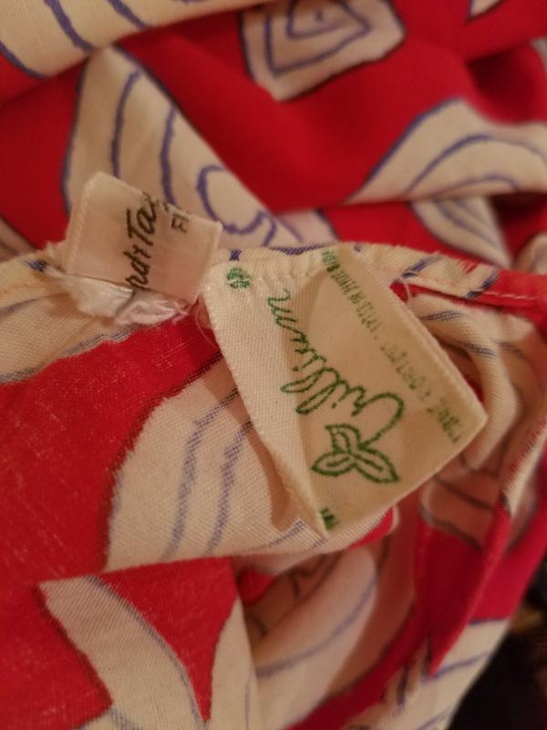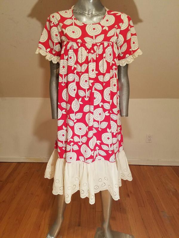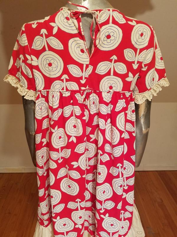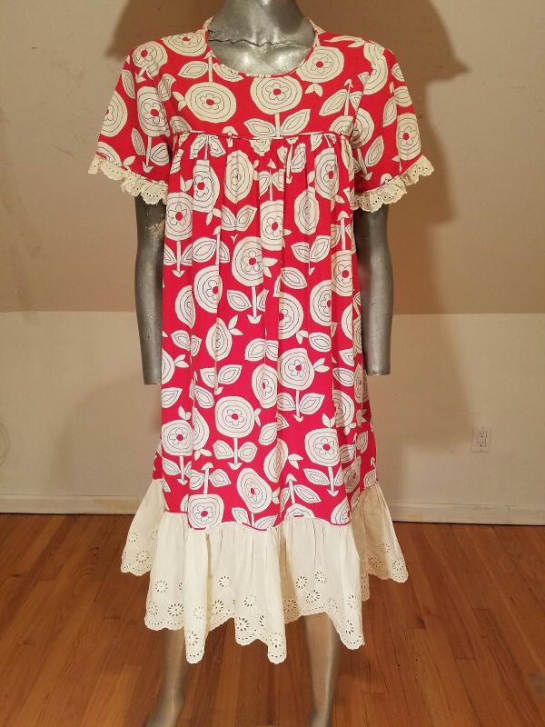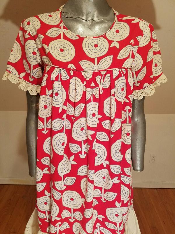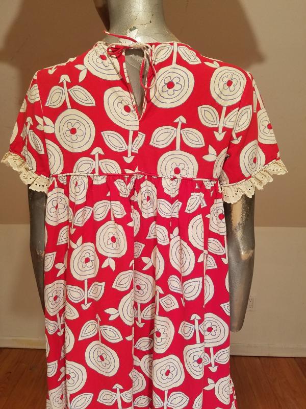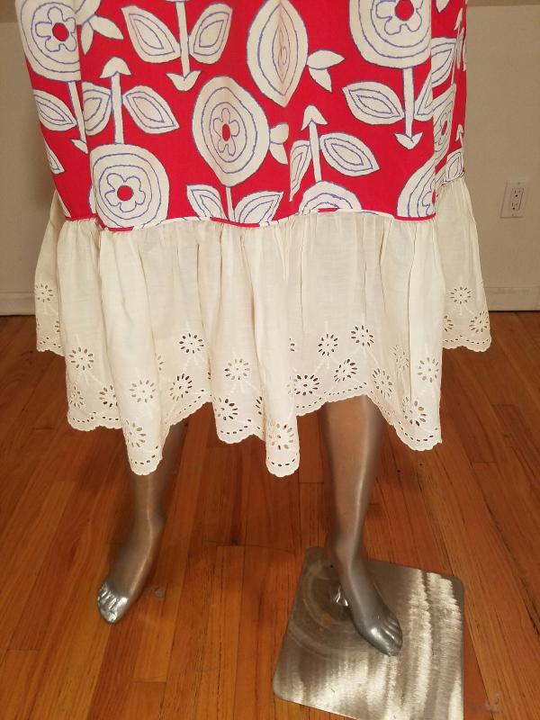 A real Boho beauty. from the late 1960's or early 1970's hand painted floral print in vibrant colors. The hemline is a wide French hand embroidered eyelet ruffle.