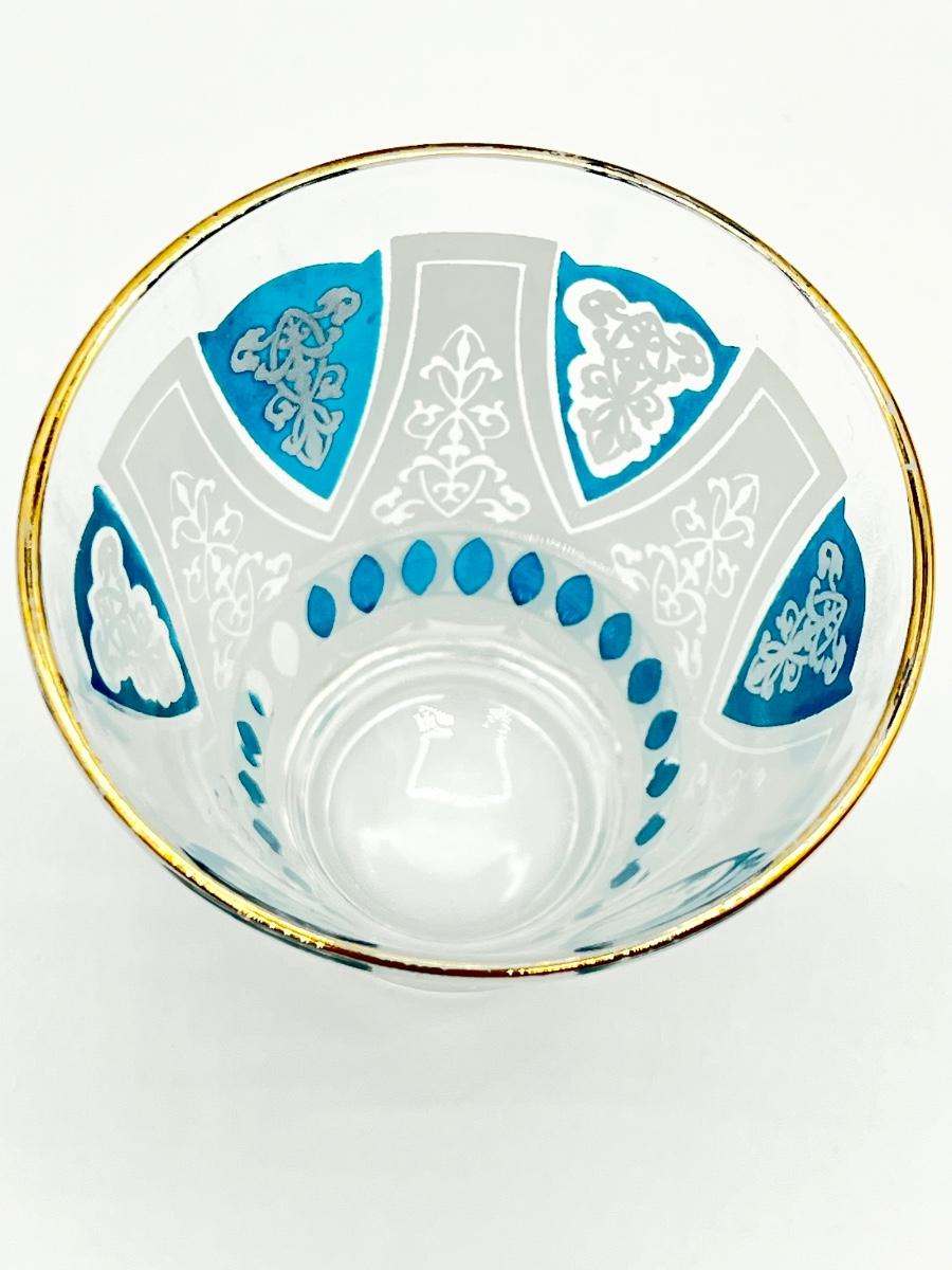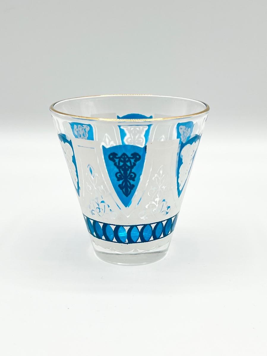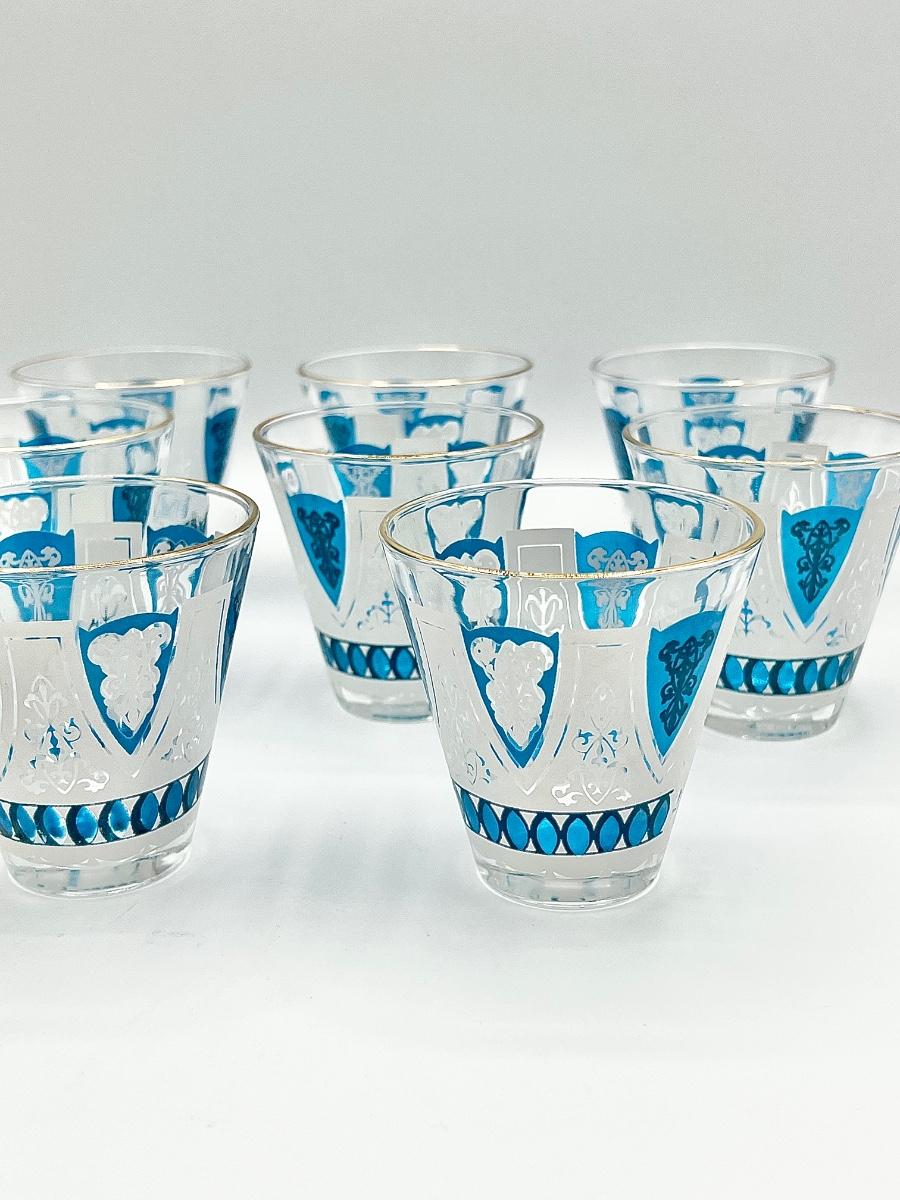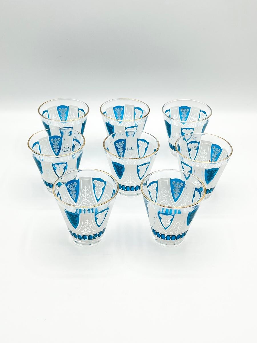 Vtg. MCM Blue & White with Gold Rim Lowballs ~ Set Of Eight (8)