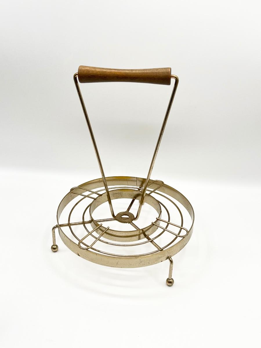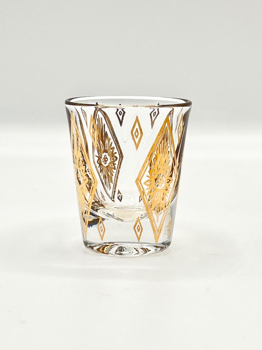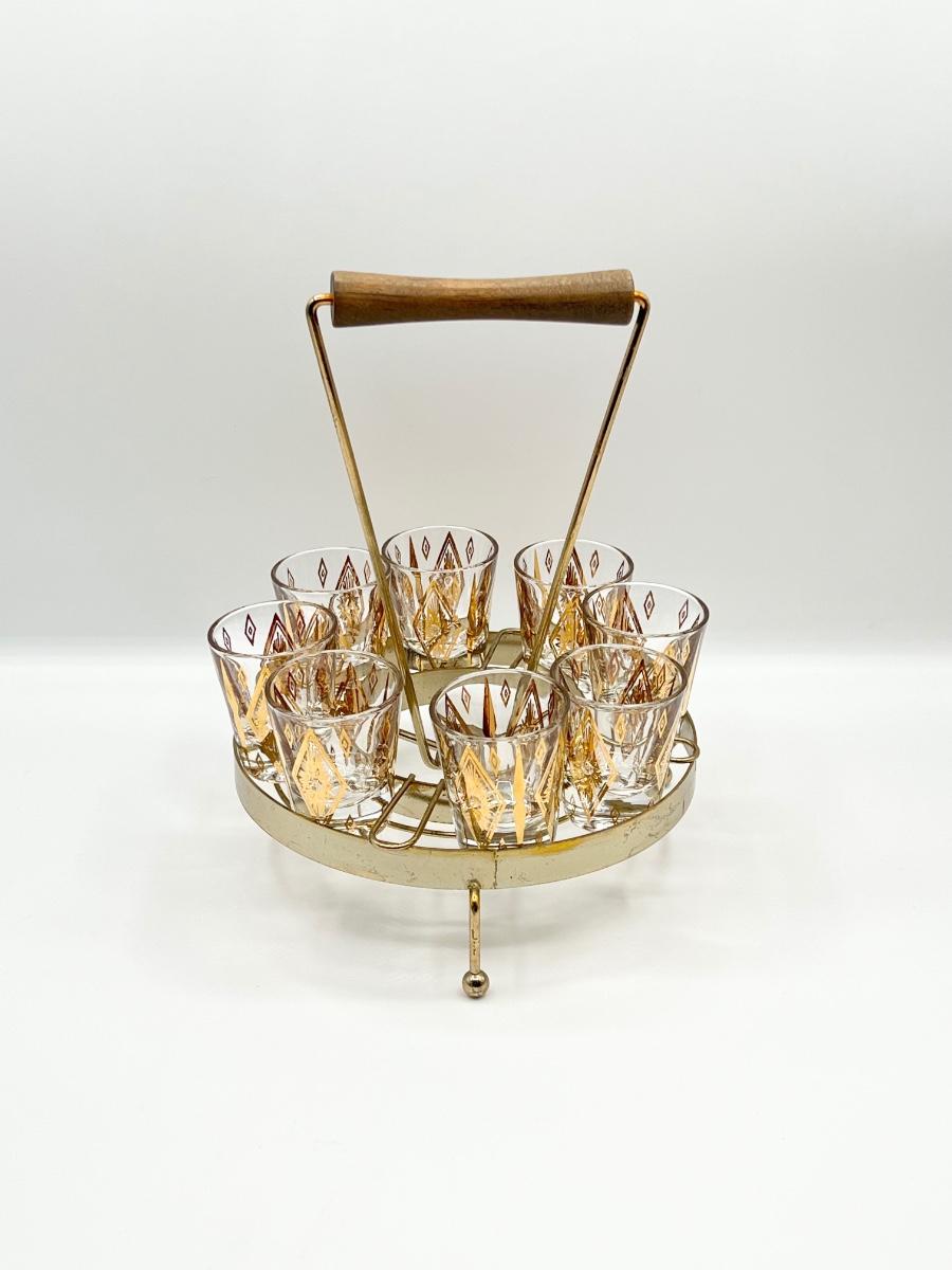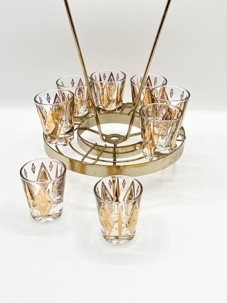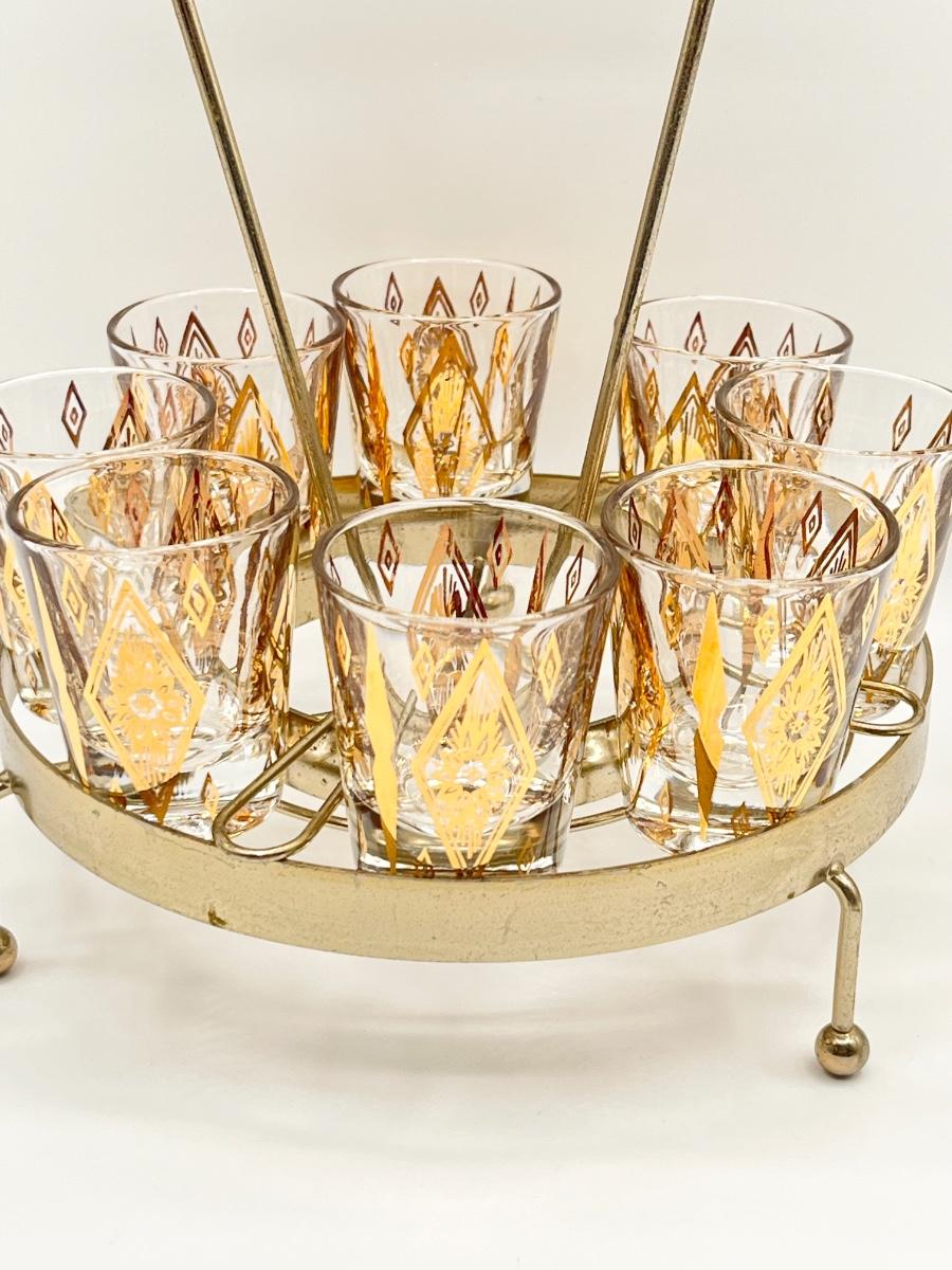 Vtg. MCM Shot Glass Set With Brushed Gold Stand