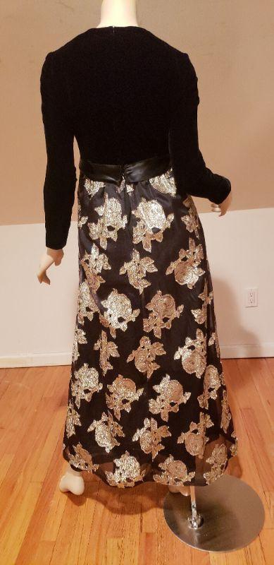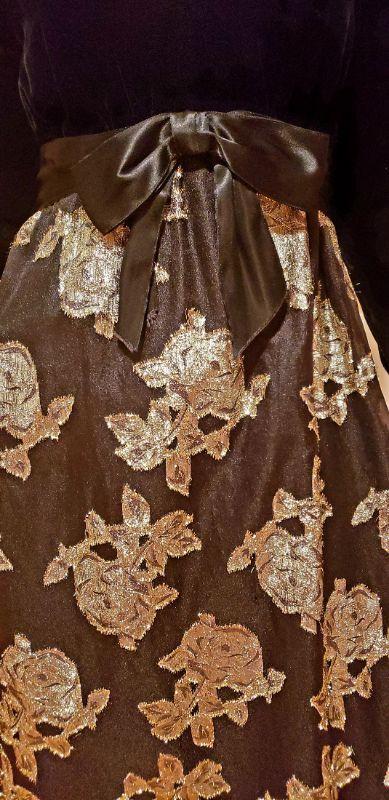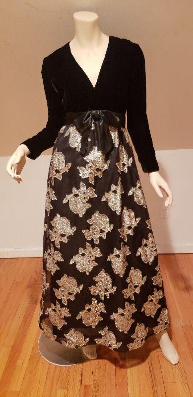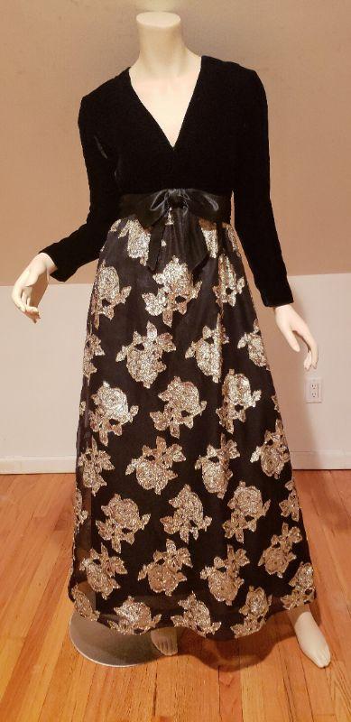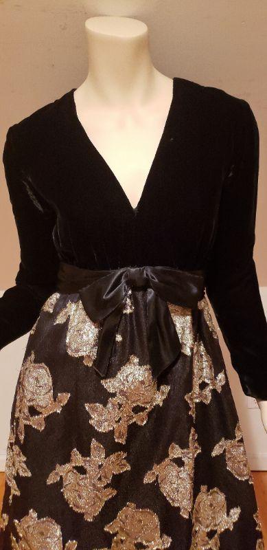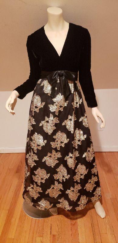 A true beauty. Rosette metallic flowers in gold lame' on an organza voile background. The top bodice is a silk black velour with a sash and silk bow. is layered and has horse hair. skirt is full. and gown is gorgeous.