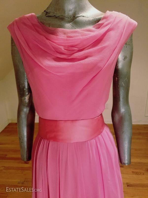 A true beauty from the Estate of MGM Hollywood Star Elaine Ravell which I am proud to present this beauty is in a cerise silk chiffon with its own sash satin belt.ease draped collar in amazing condition. Truly a rare Hollywood MGM Collectible Actor History