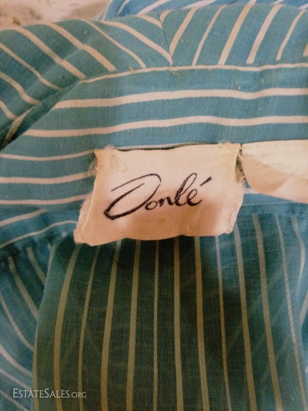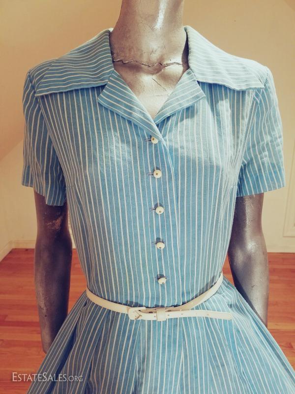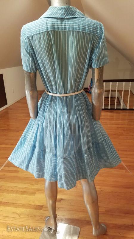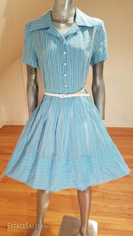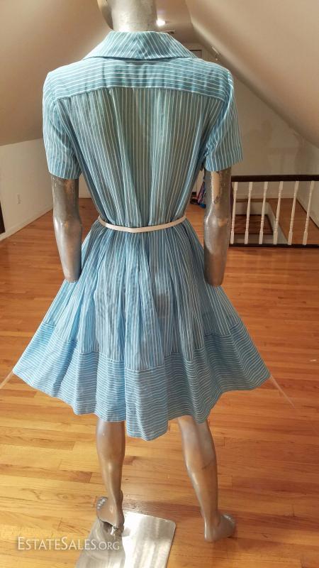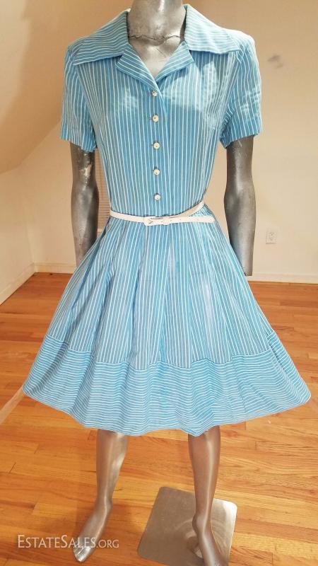From the Estate of MGM actor Elaine Ravell I am presenting here this beautiful aqua stripe muslin dress with belt and button front. full sweep incredible condition and look by Onle'