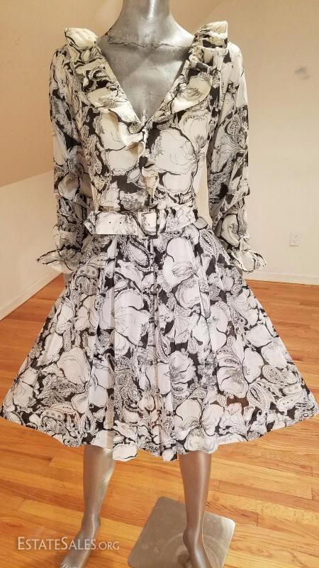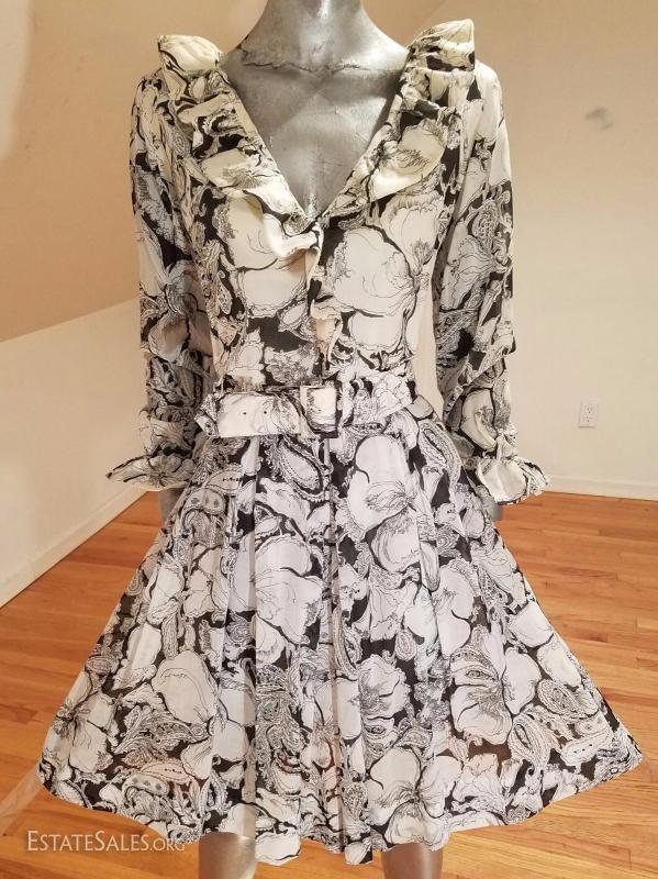 A rare sweep black/white Muslin floral hand printed sweep dress with its own buckle belt from the estate of MGM star of the 1940's Elaine Ravell. A rare piece of Film and Actor history which I was lucky to inherit. In amazing vintage condition.