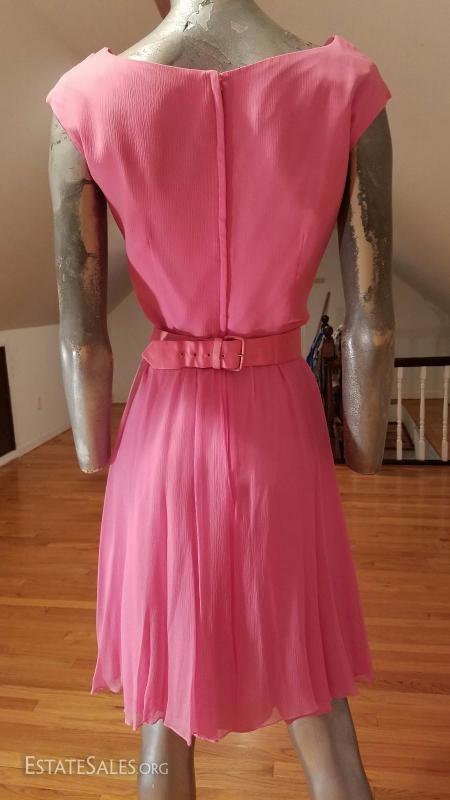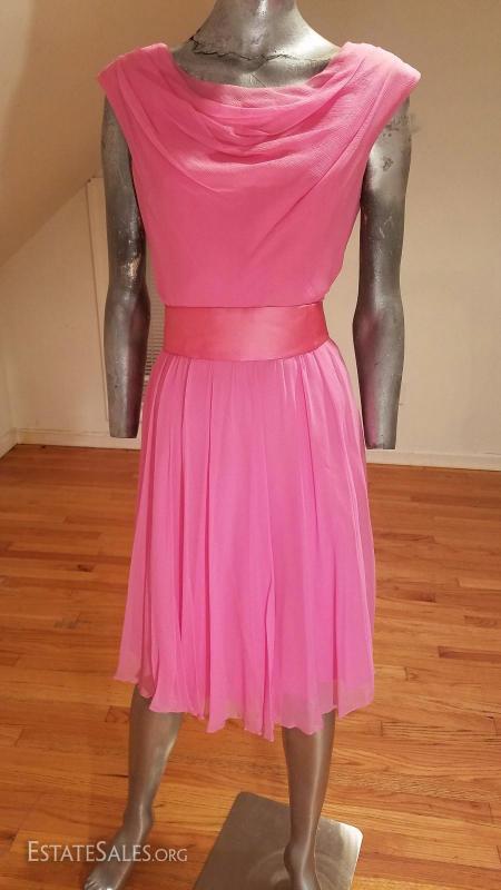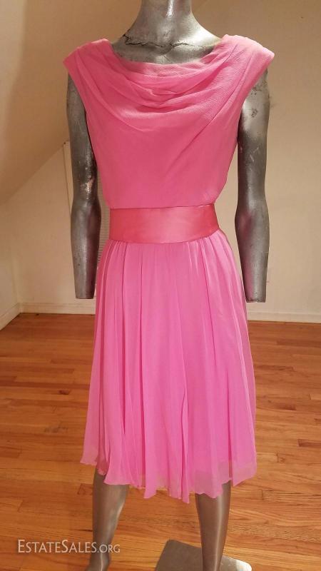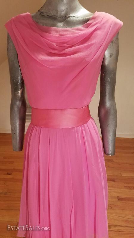 A true beauty from the Estate of MGM Hollywood Star Elaine Ravell which I am proud to present this beauty is in a cerise silk chiffon with its own sash satin belt.ease draped collar in amazing condition. Truly a rare Hollywood MGM Collectible Actor History
