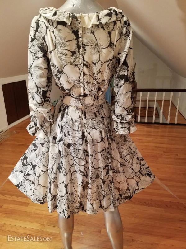 A rare sweep black/white Muslin floral hand printed sweep dress with its own buckle belt from the estate of MGM star of the 1940's Elaine Ravell. A rare piece of Film and Actor history which I was lucky to inherit. In amazing vintage condition.