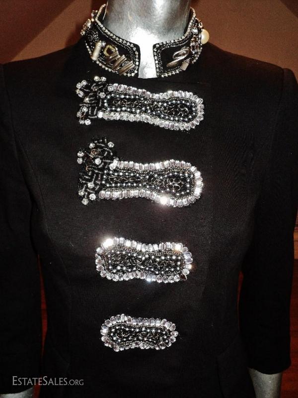 Chains, Rhinestones, Pearls , Metal figurines beads etc. It is an amazing piece of wearable art.