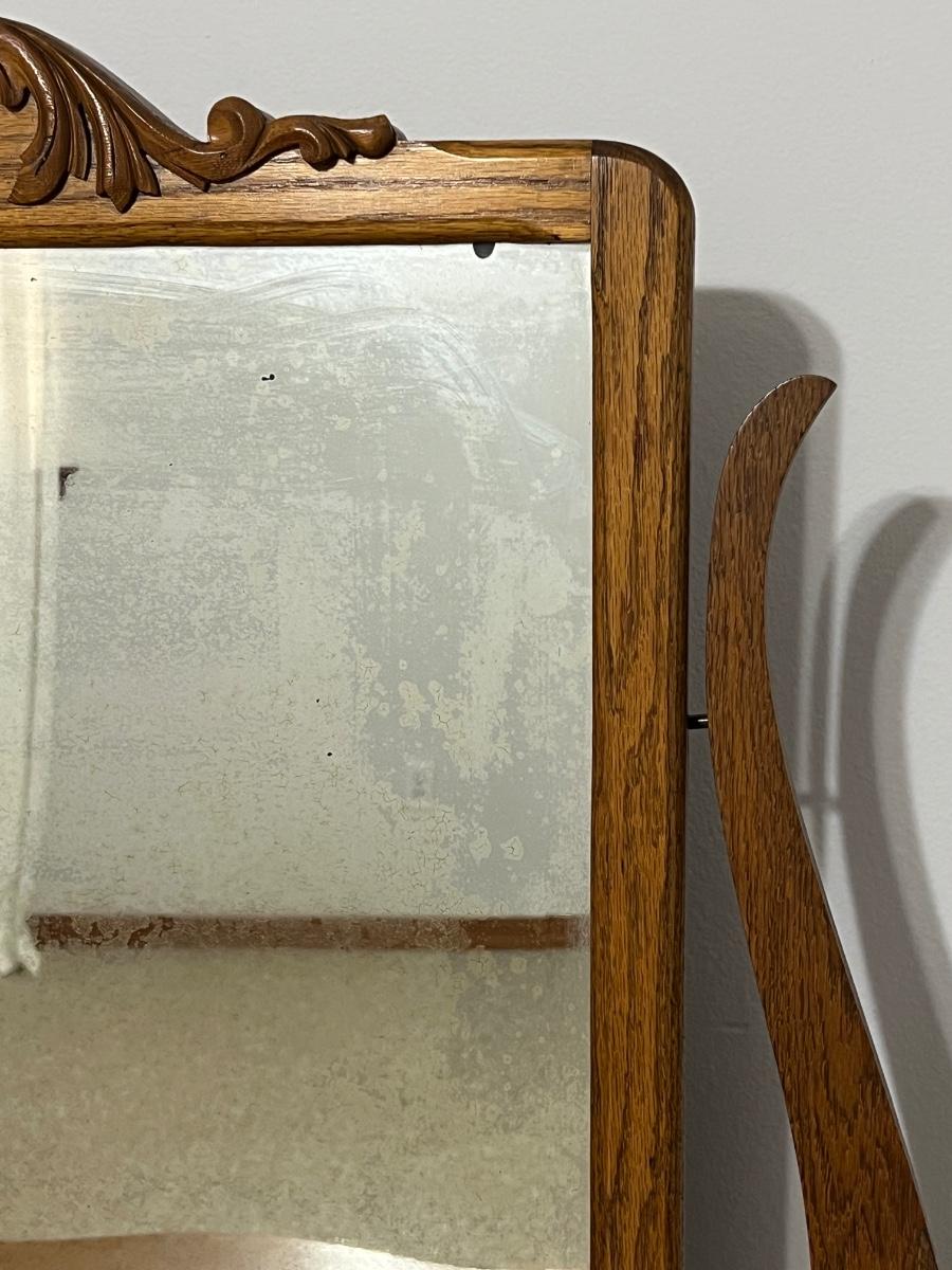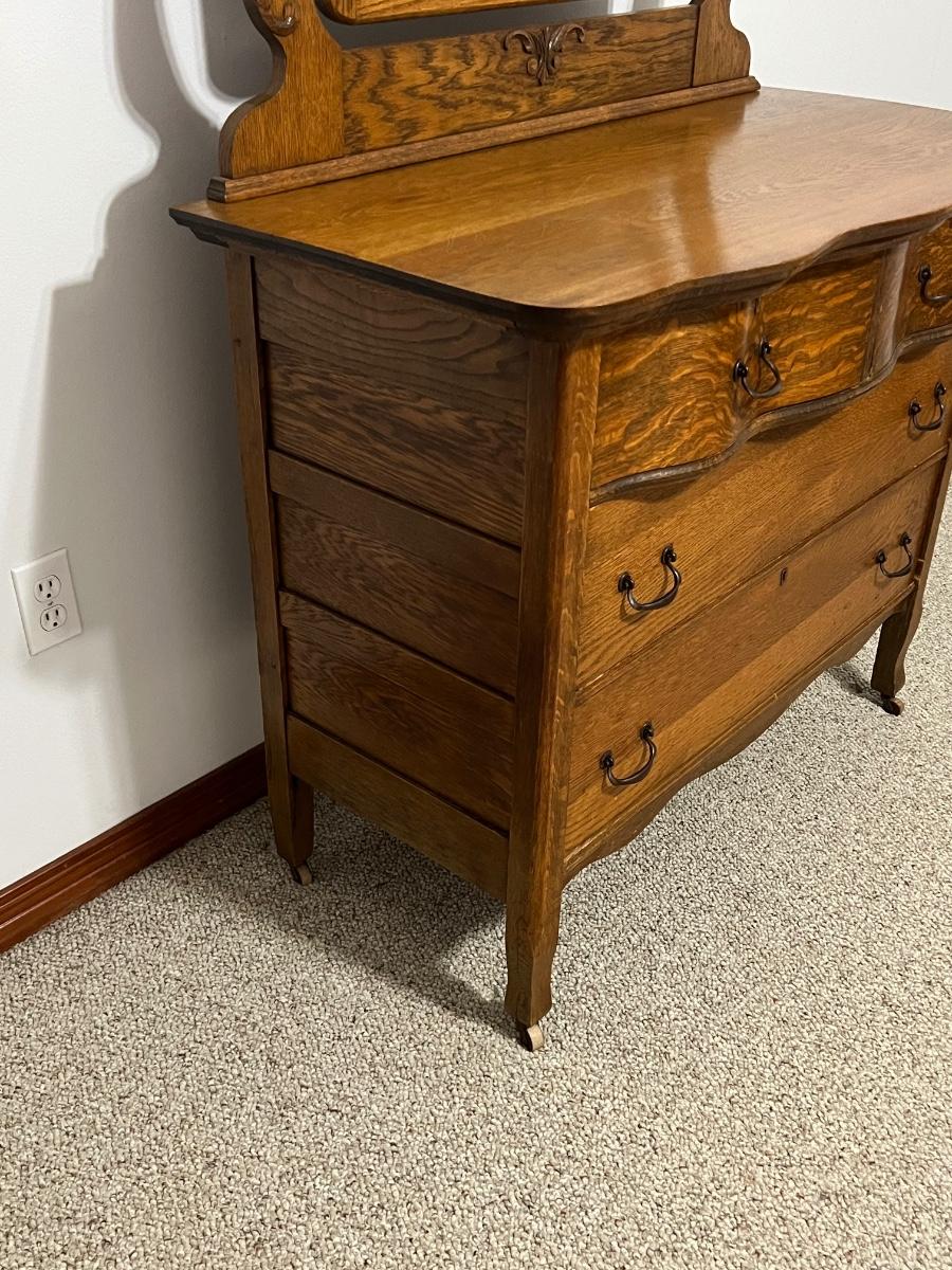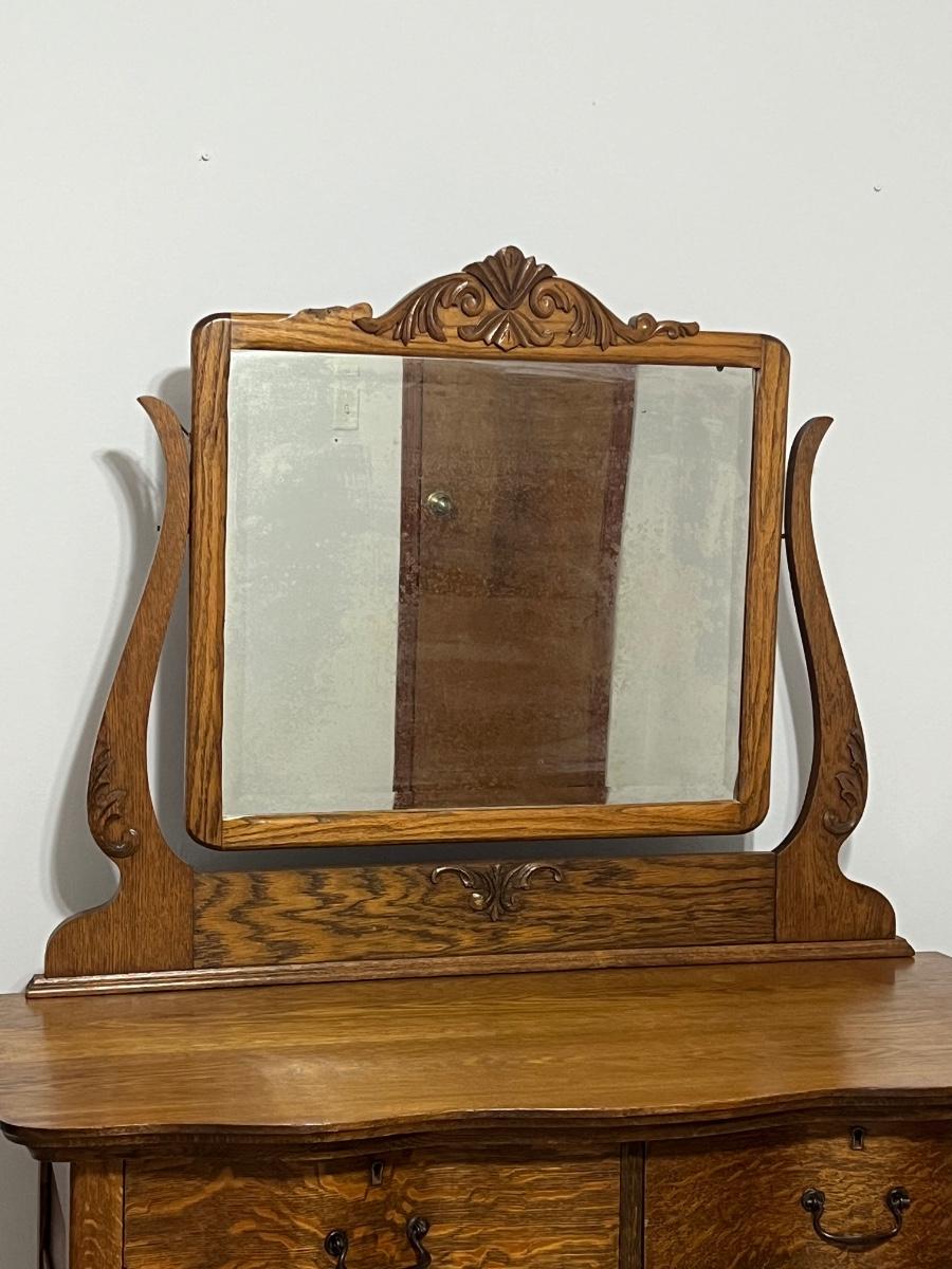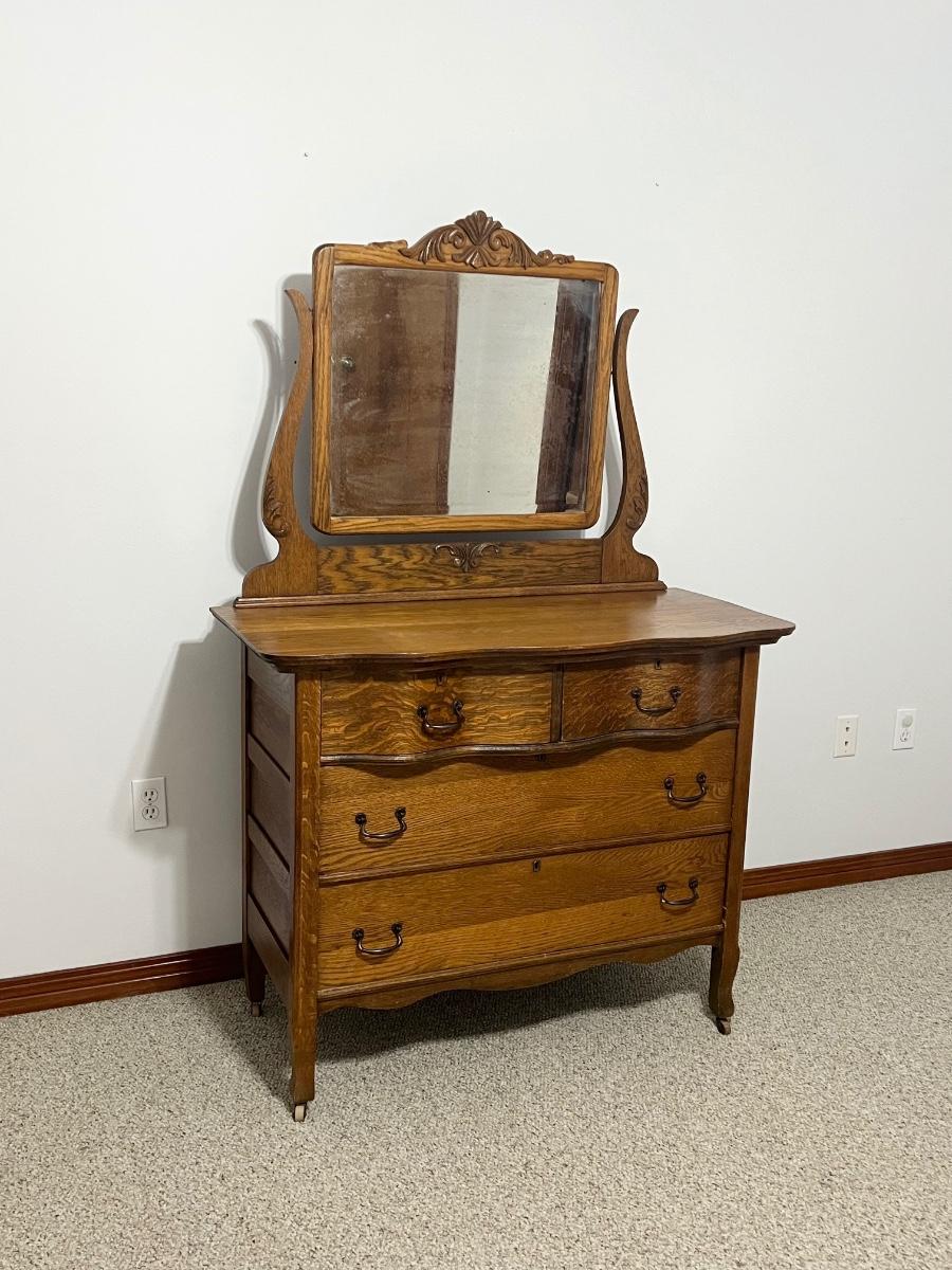 2-pieces ~ Drawers slide easily ~ Has wood canisters ~ Mirror has desilvering from age & a small piece of trim is missing on mirror, see photos ~ Do not have key ~ 66” H x 43” W x 21.5” D
