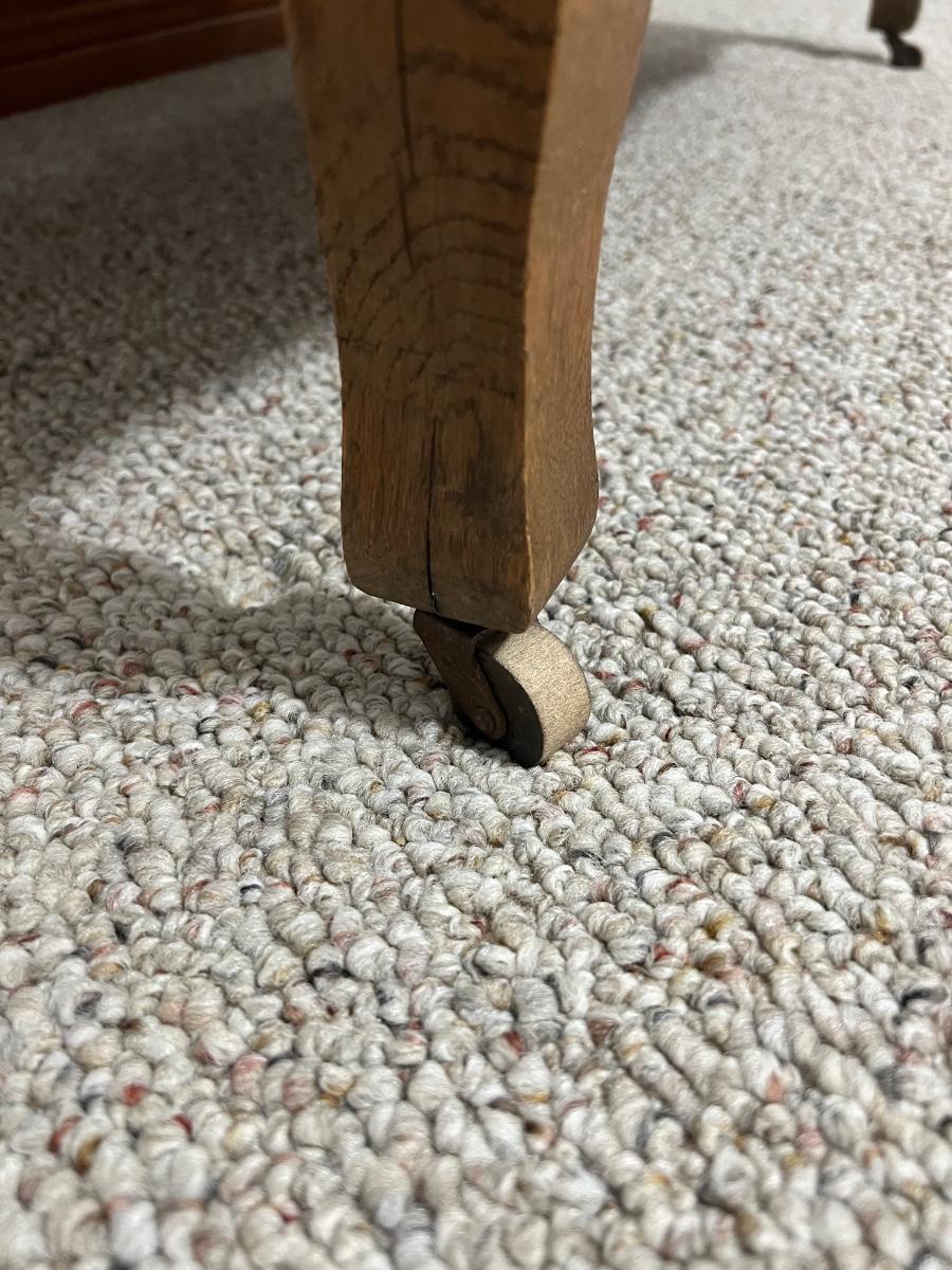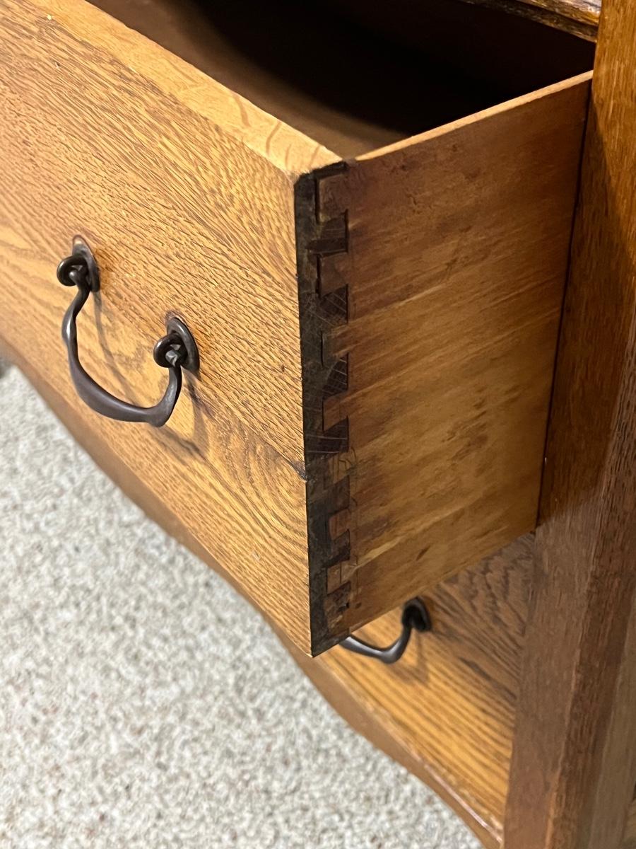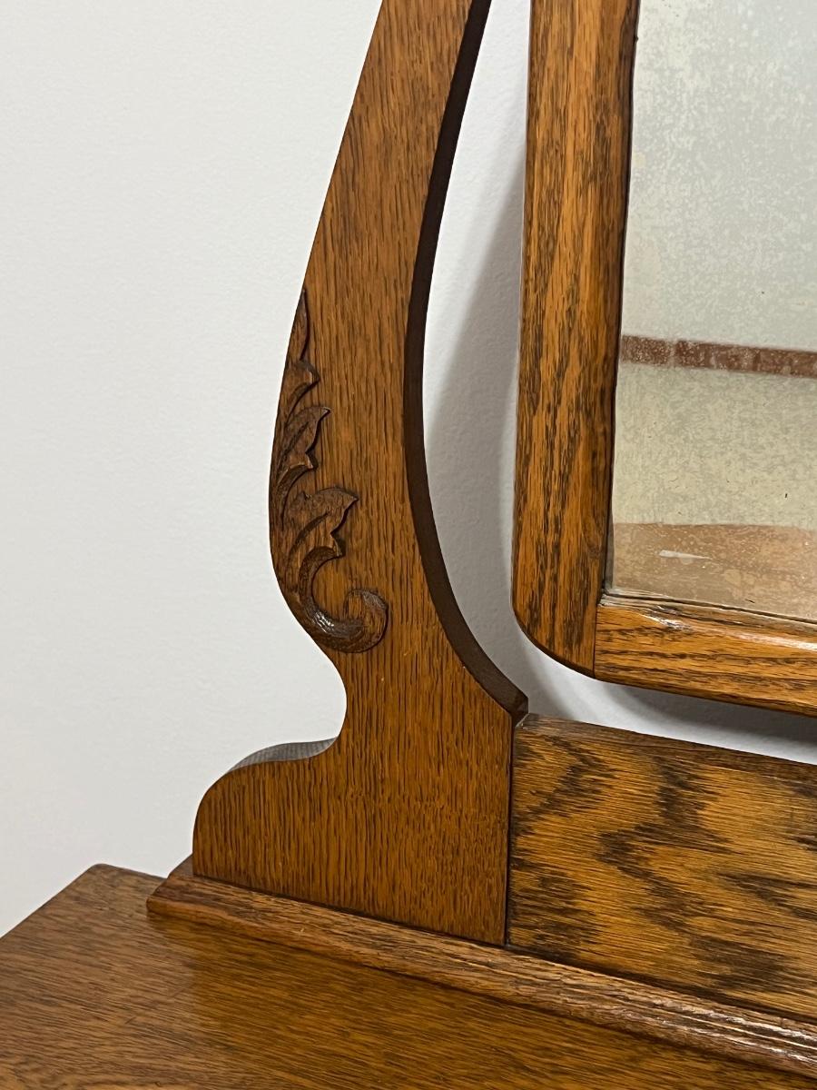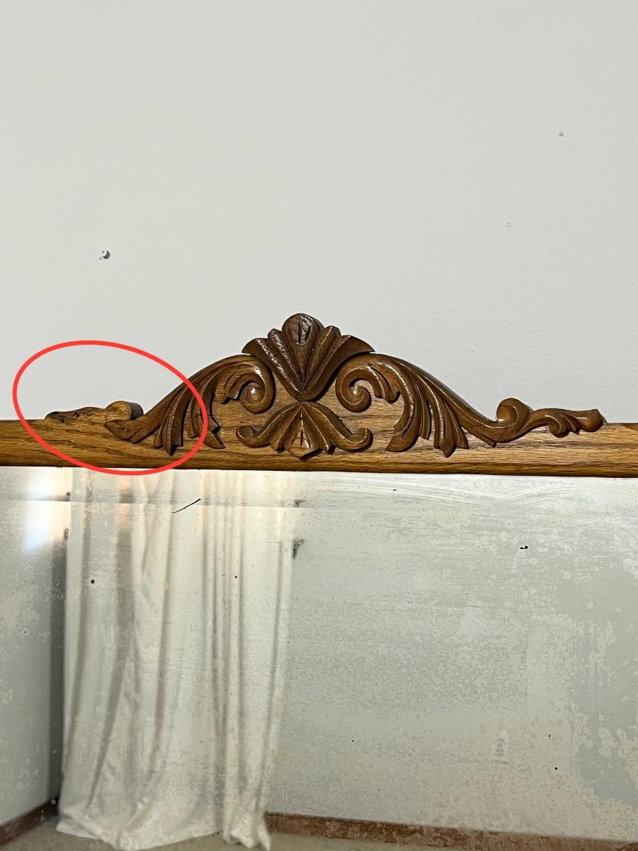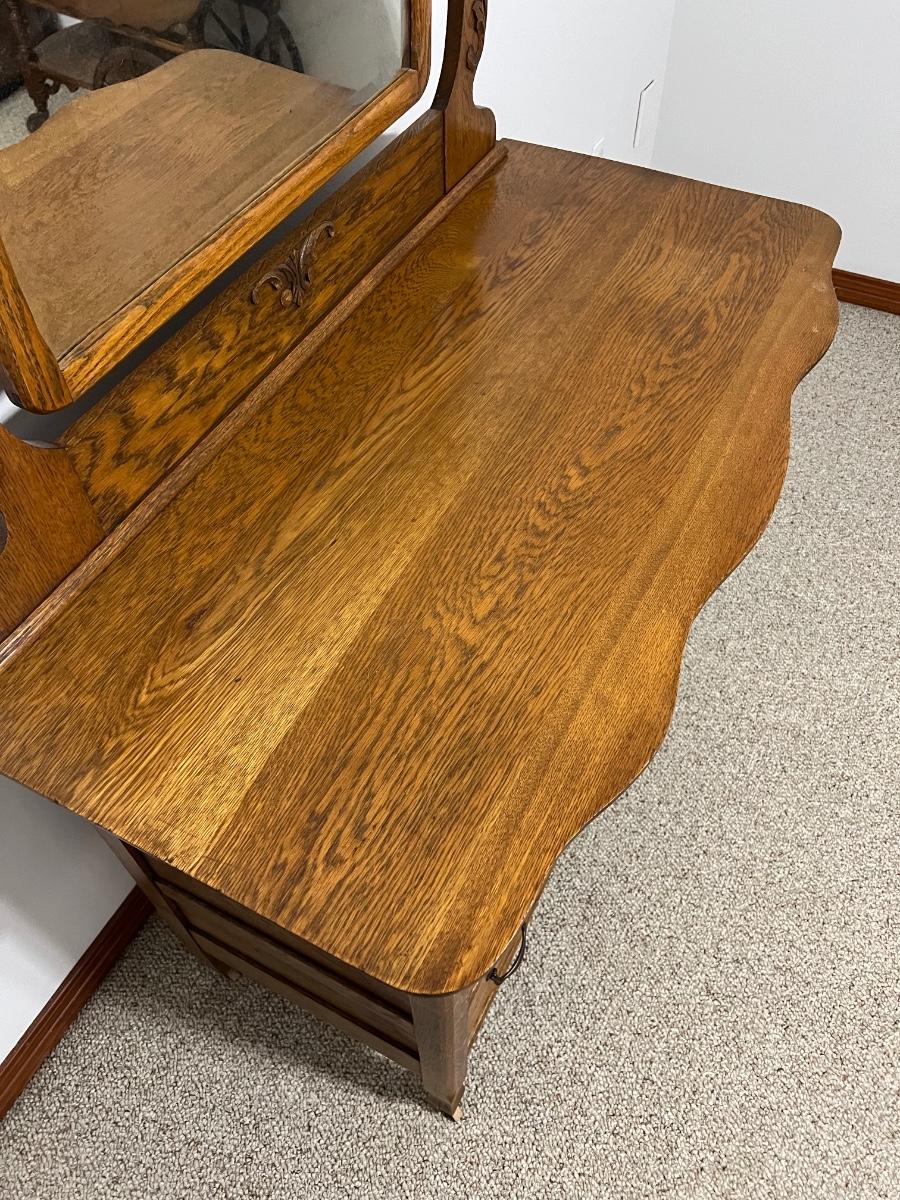 2-pieces ~ Drawers slide easily ~ Has wood canisters ~ Mirror has desilvering from age & a small piece of trim is missing on mirror, see photos ~ Do not have key ~ 66” H x 43” W x 21.5” D