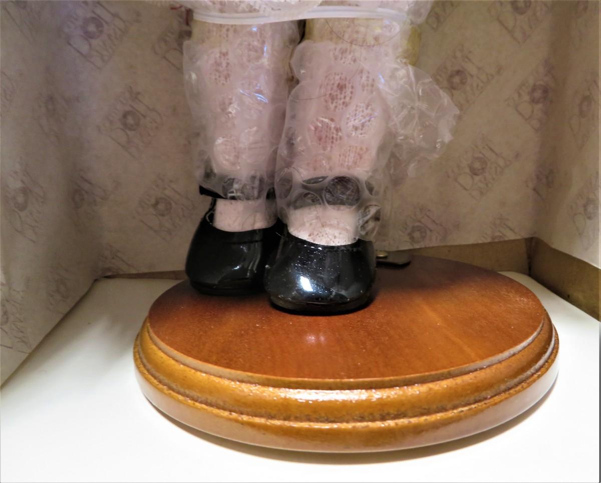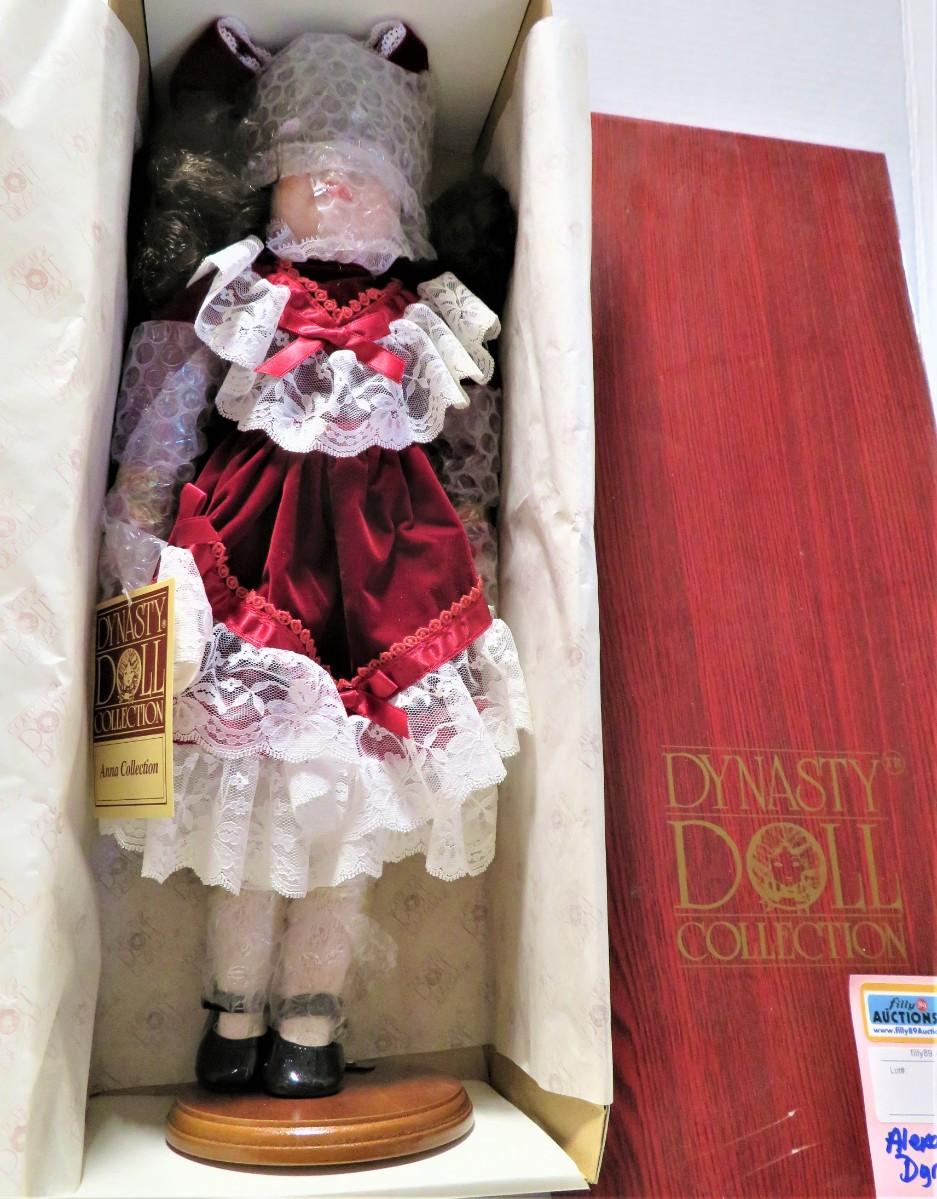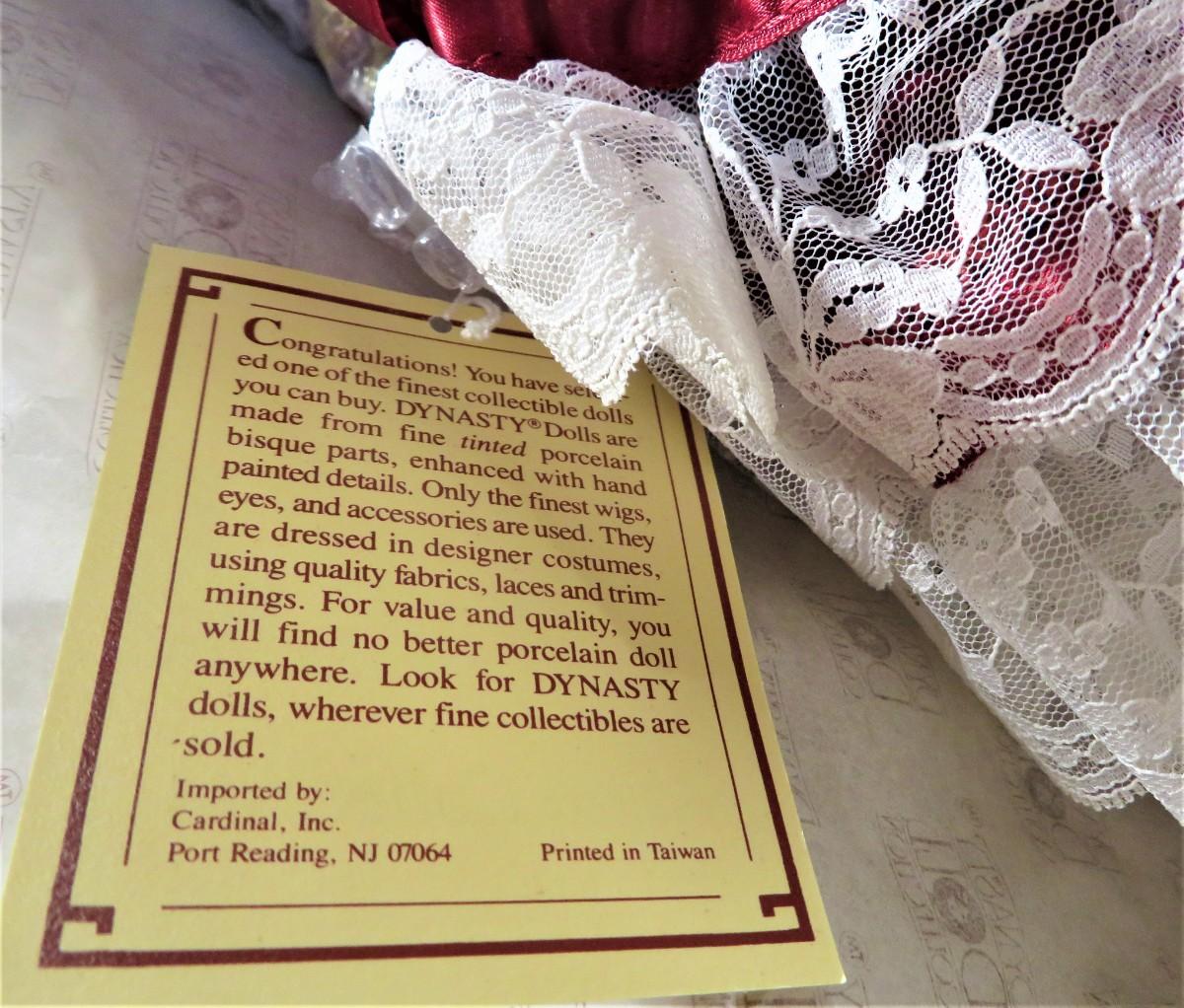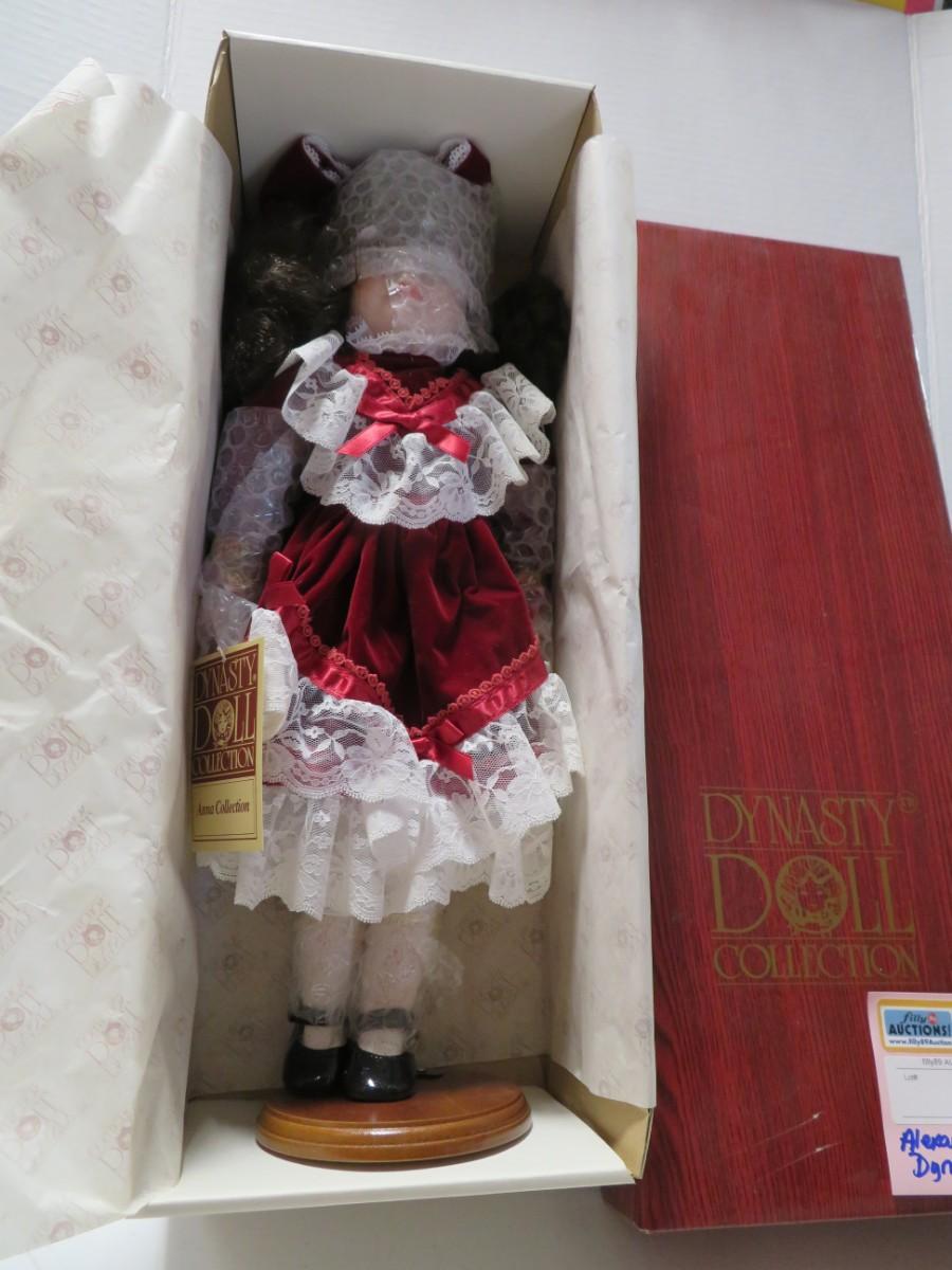 Vintage White Lace ANNA Collection Dynasty DOLLS " Alexandra " with Brown hair with Red Maroon Velvet Dress and White Lace dress. With stand. Box Measures 19 x 7.5". # D937.6 Taiwan. Certificate of Authenticity.