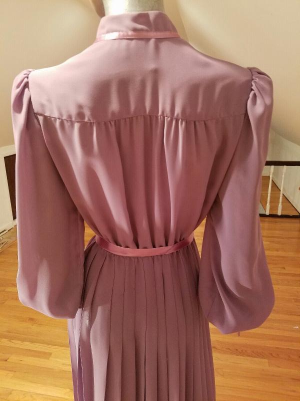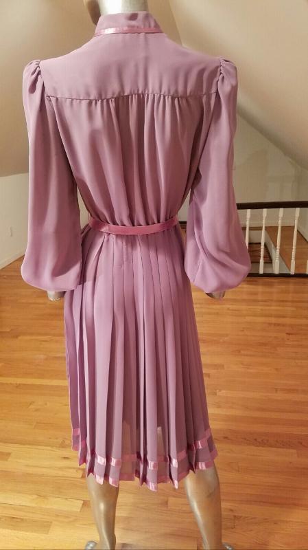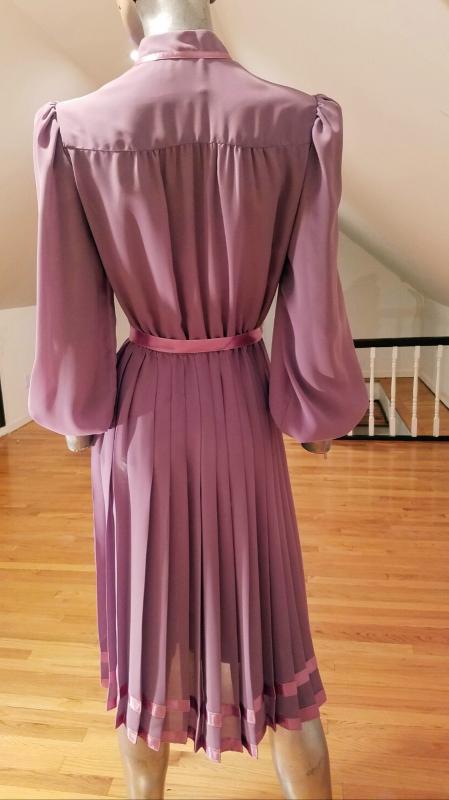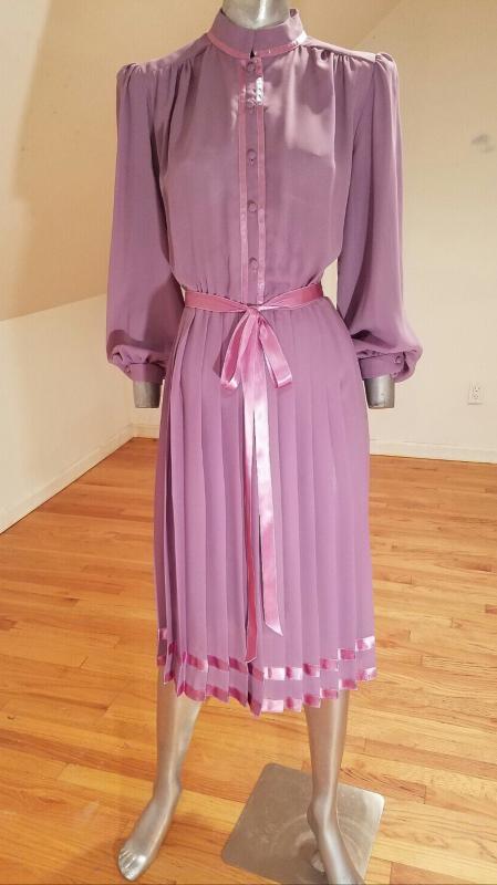 Amazing dress in a beautiful violet coloration, the bodice is mandarin with button front , the skirt is all pleated and adorned with violet ribbons for trims.In very good vintage condition Circa 1960's. Vintage size 13