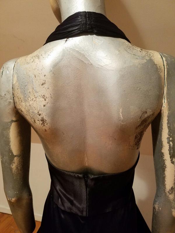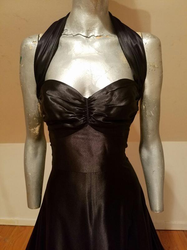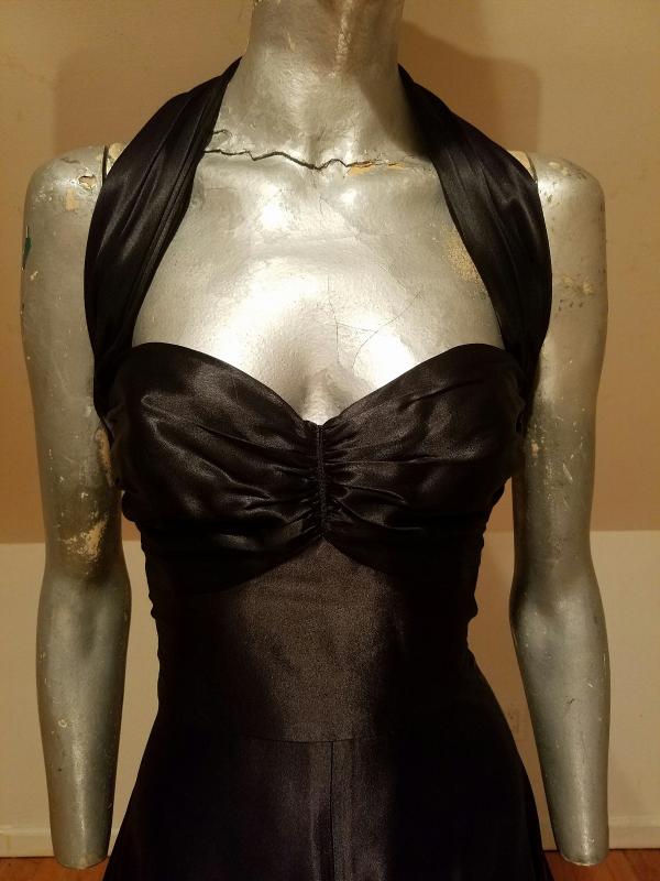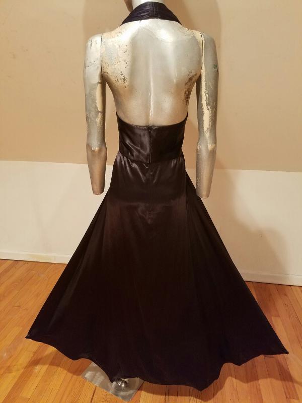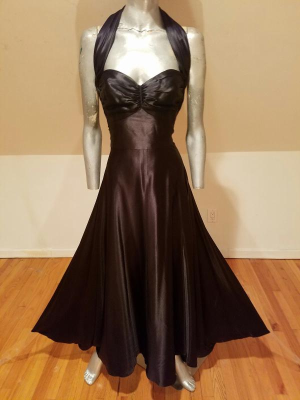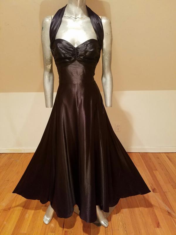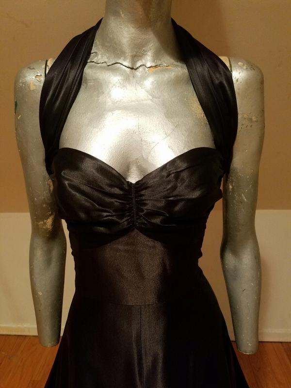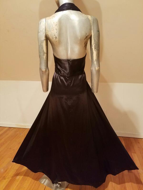 A fabulous Vintage Norma Kamali Omo 1940's inspired gown in satin Peau de Soie, with pleated shirred halter bodice Gorgeous flowing skirt. Truly a Hollywood Regency Look. And what a beauty.