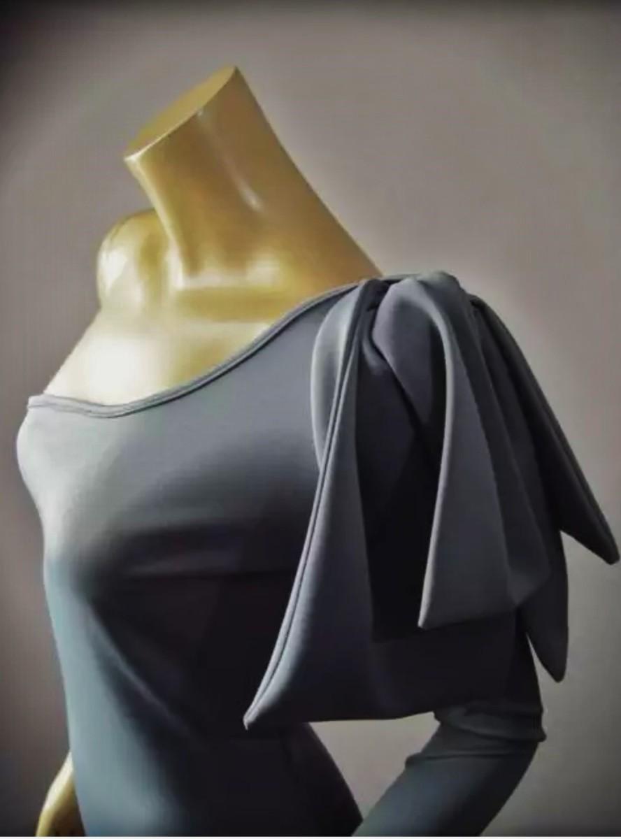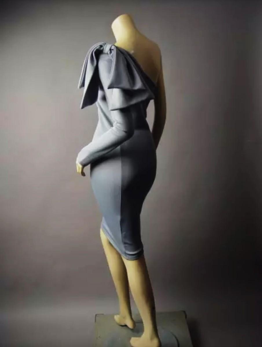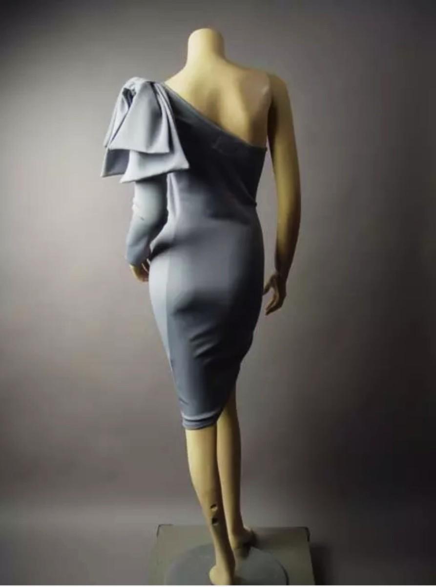 Quite beautiful one shoulder body con gray dress with sculptural over sized bow.