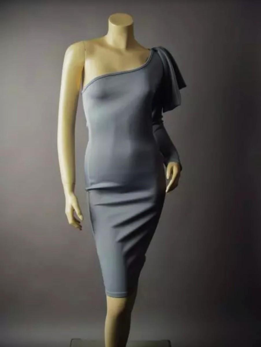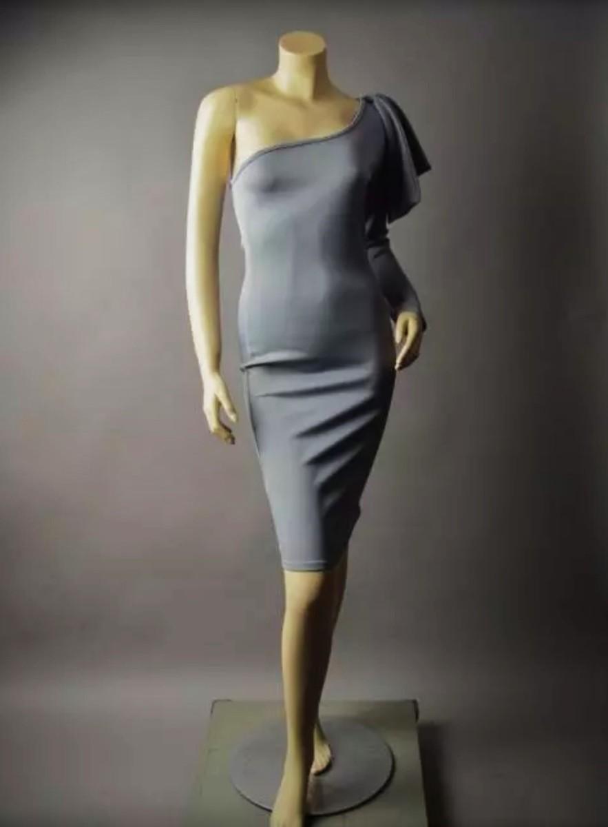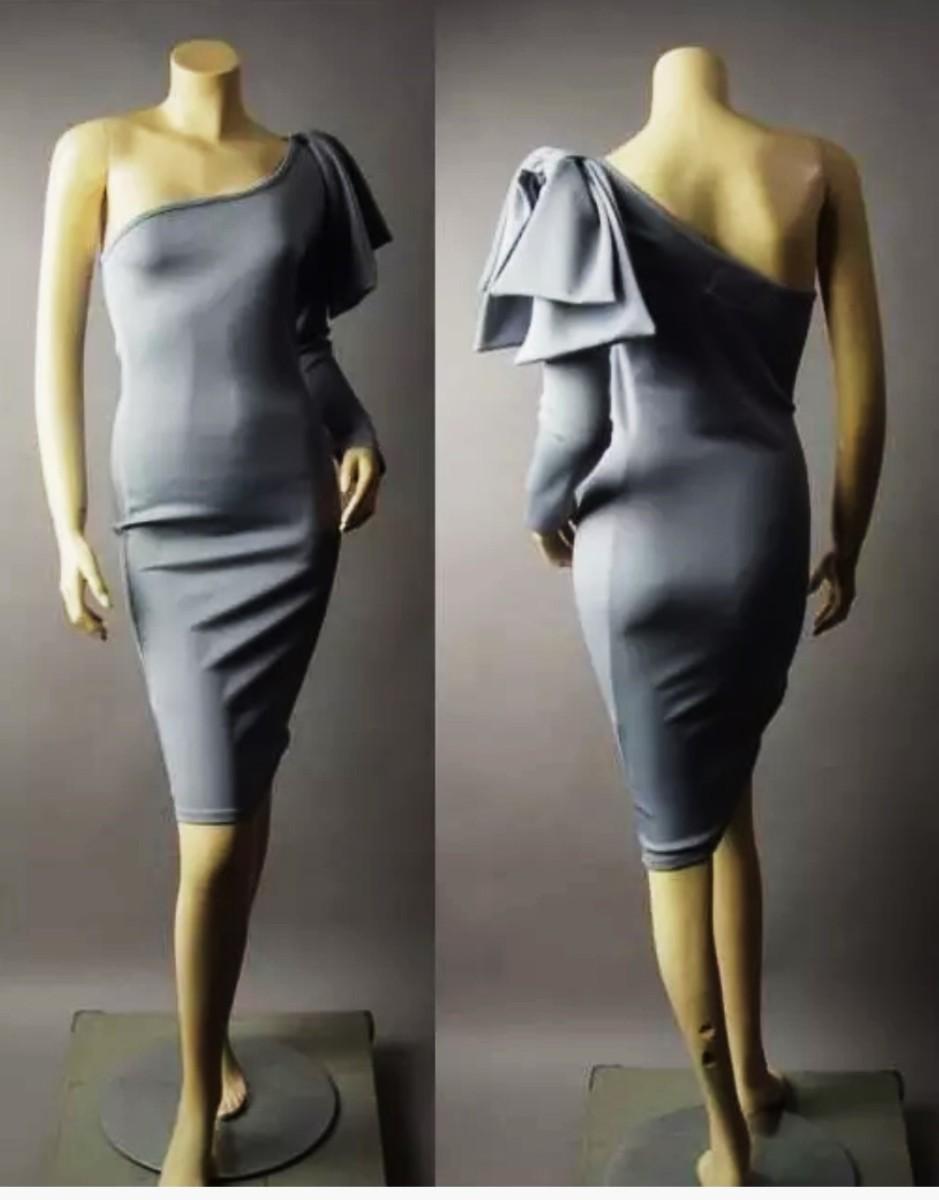 Quite beautiful one shoulder body con gray dress with sculptural over sized bow.