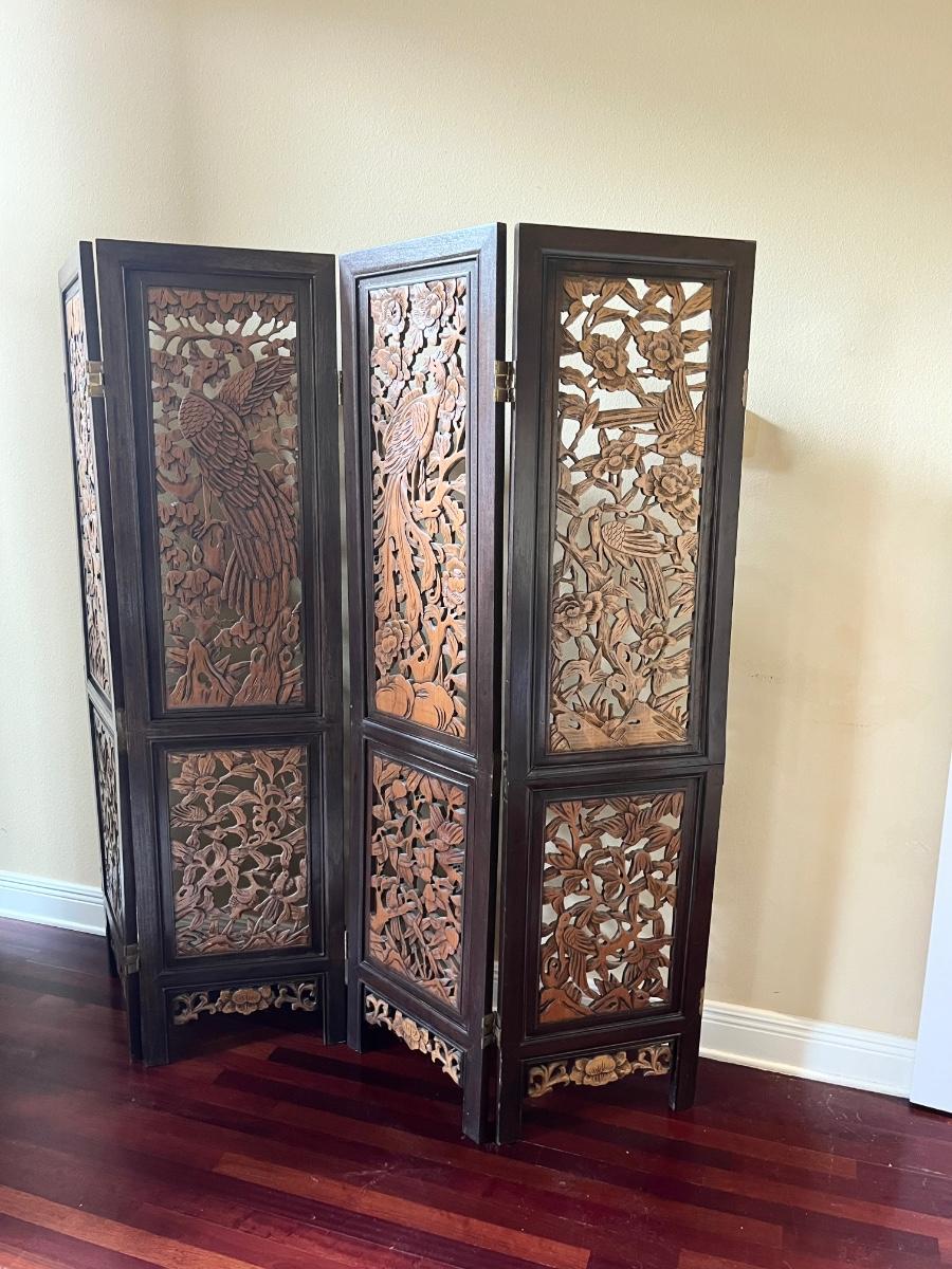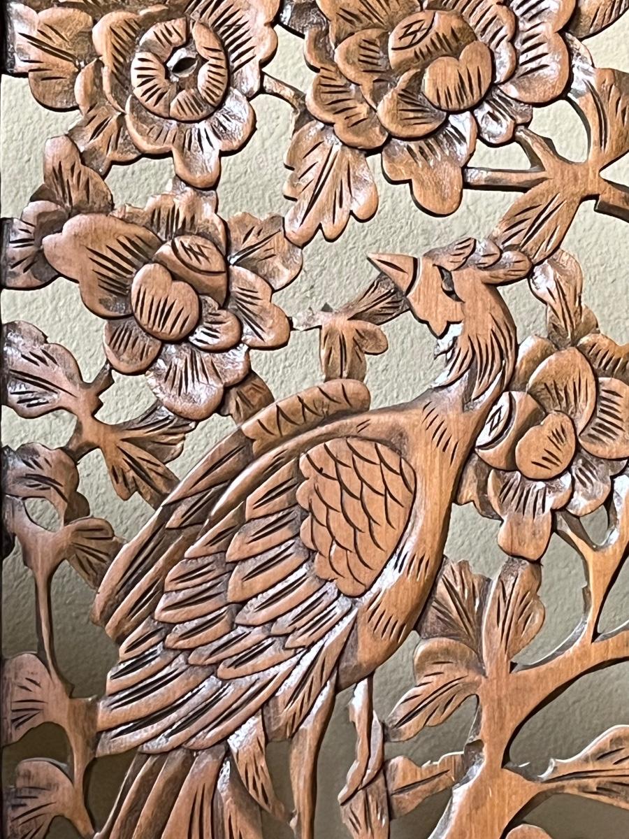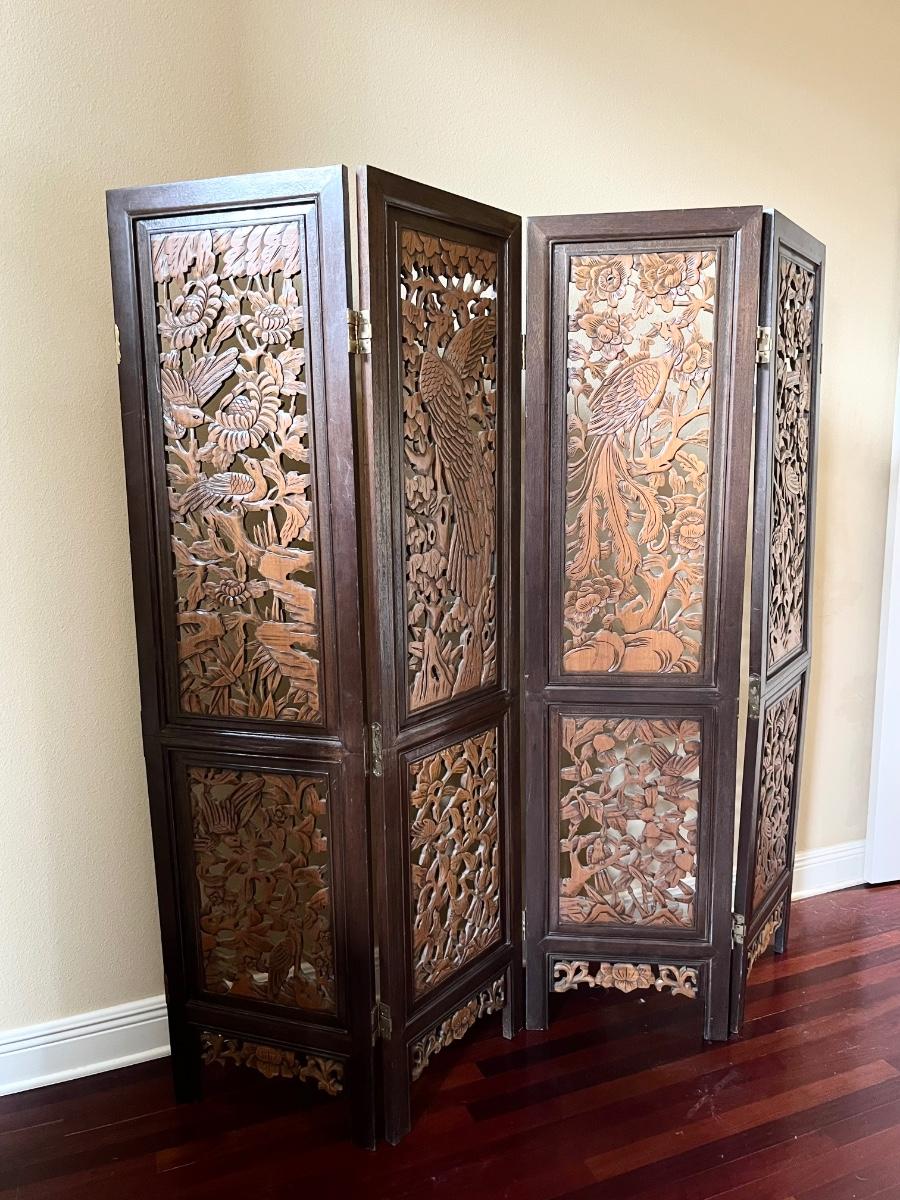 Bird Themed Carved Wood Four (4) Panel Decorative Screen