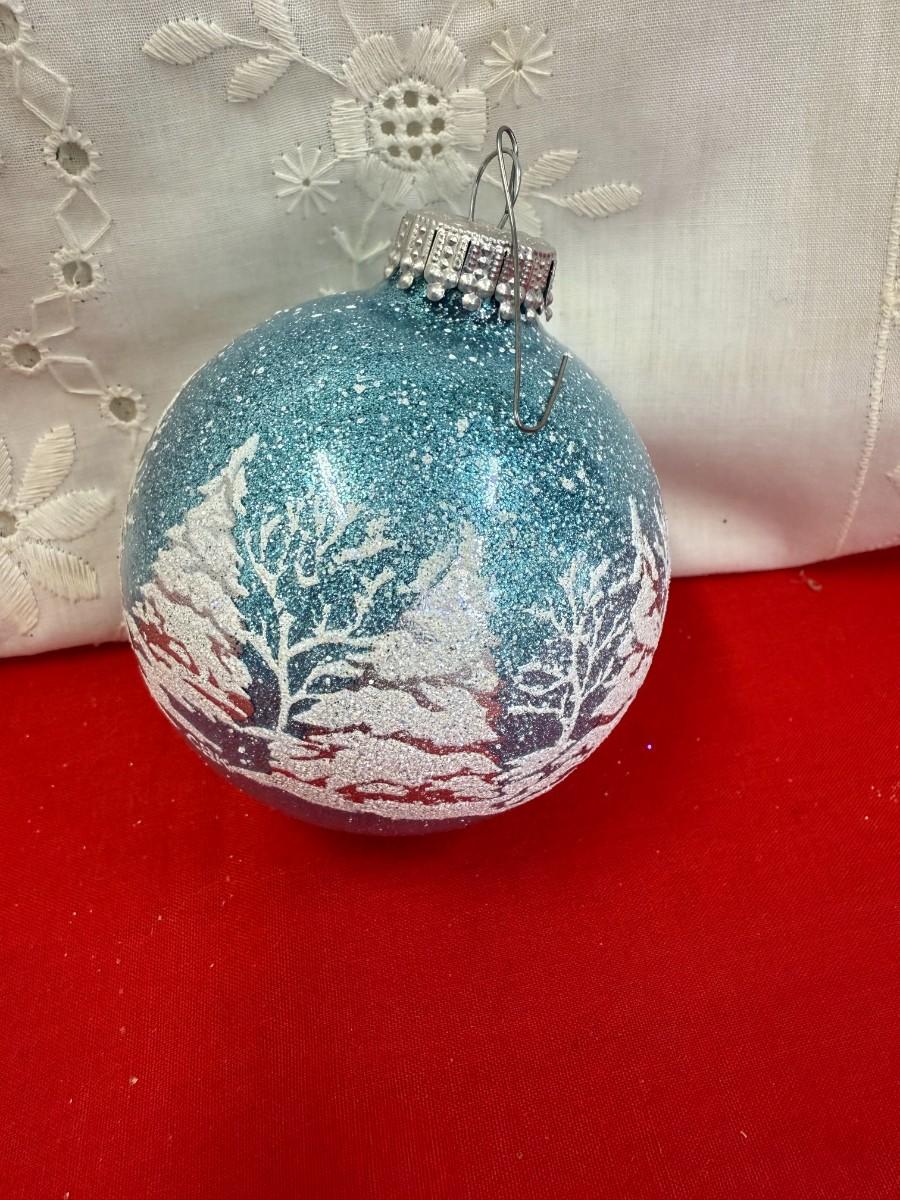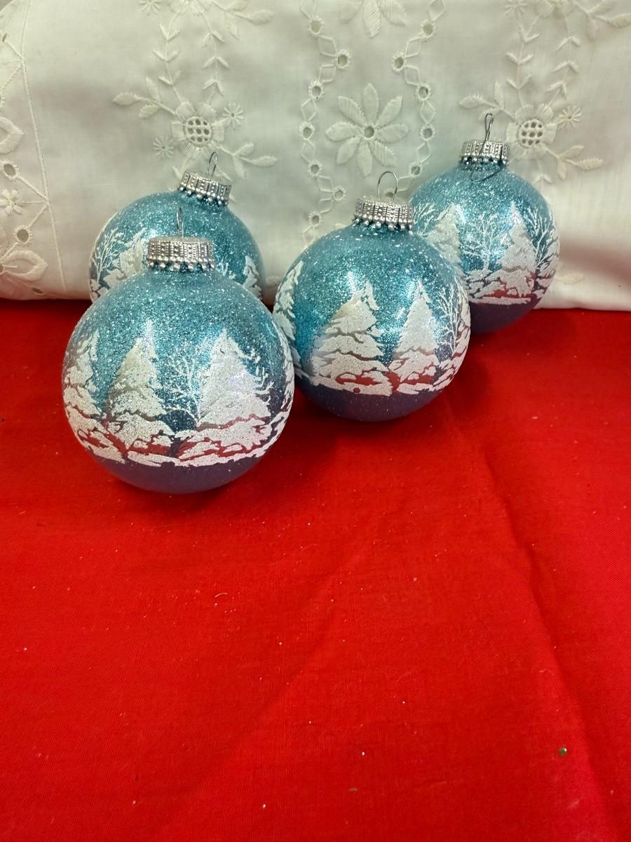 Vtg ornament lot of 4 Blue With White Trees and Glitter Retro Christmas Decorations