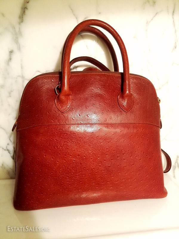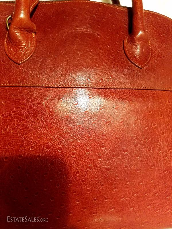 This one is amazing in look color and design. large Ostrich leather in camel coloration with long shoulder strap. The bag is in very good vintage condition great on the outside. There is a bit of scuffing inside at the top on the leather lining but otherwise just amazing bag.