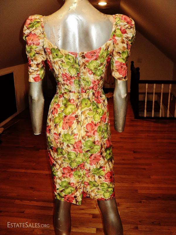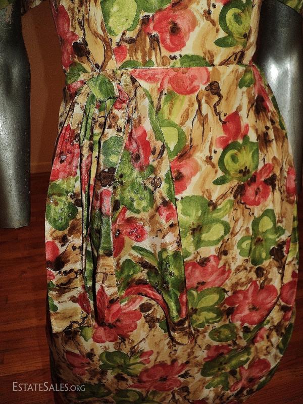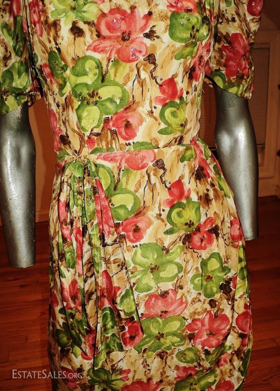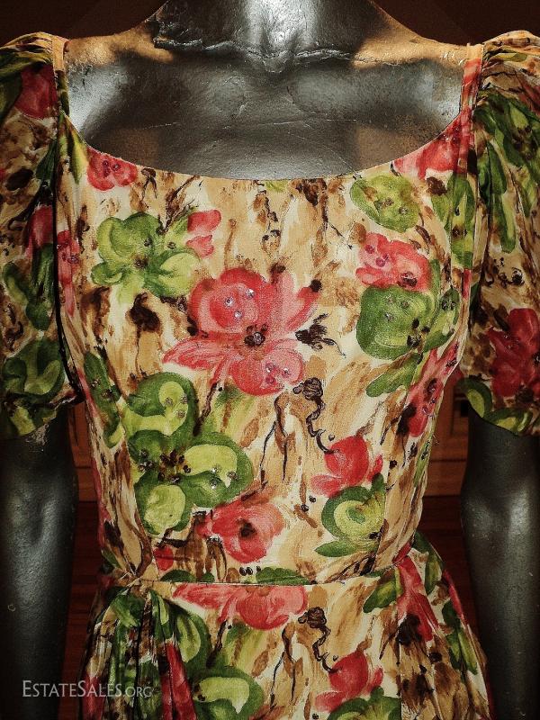 A real beauty from the 1950's all hand painted floral print with sequins and beads at the bodice and side tie