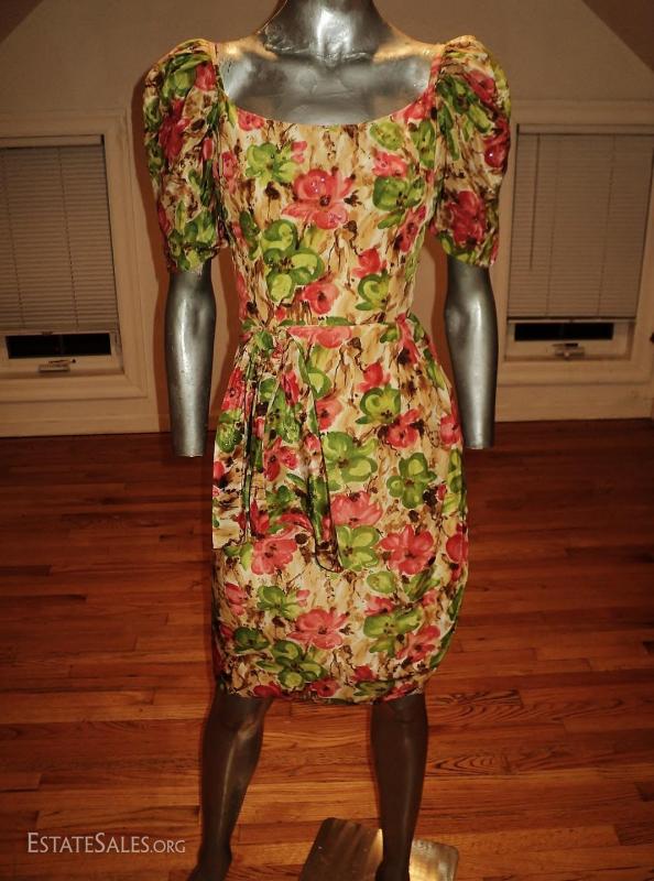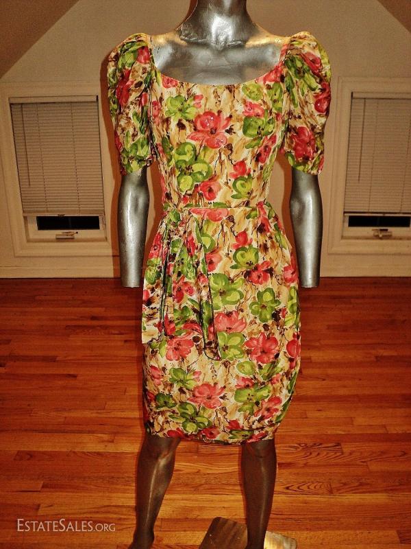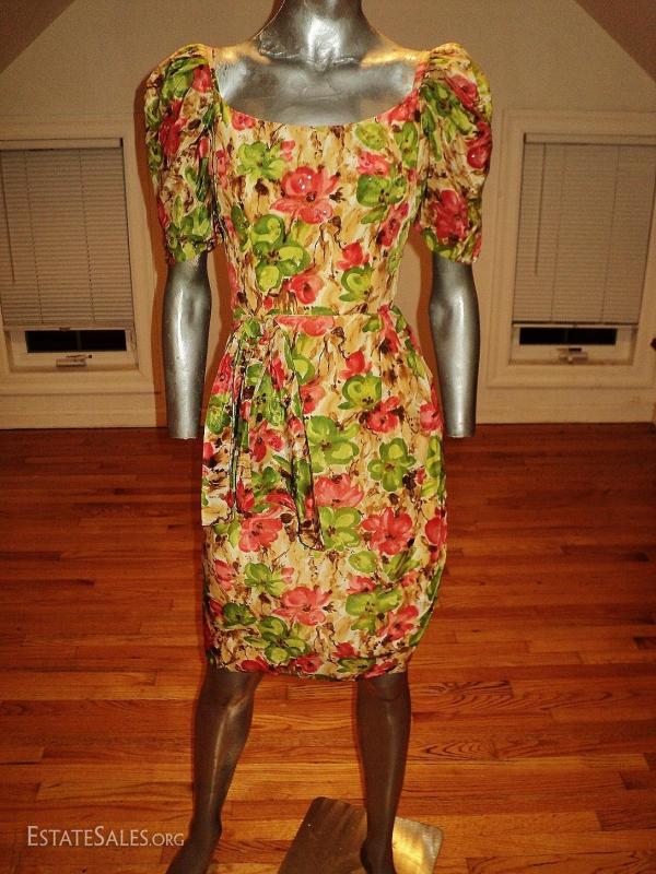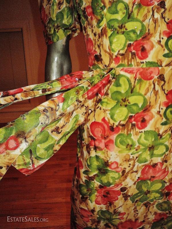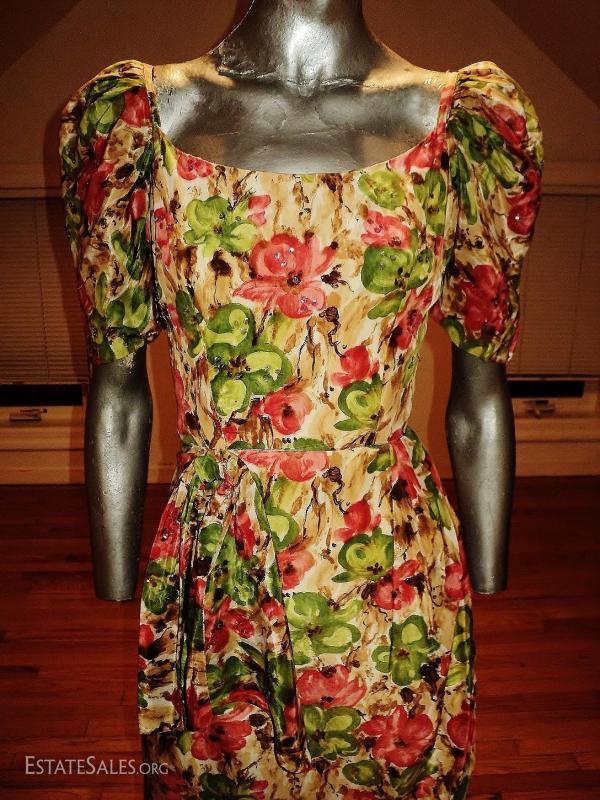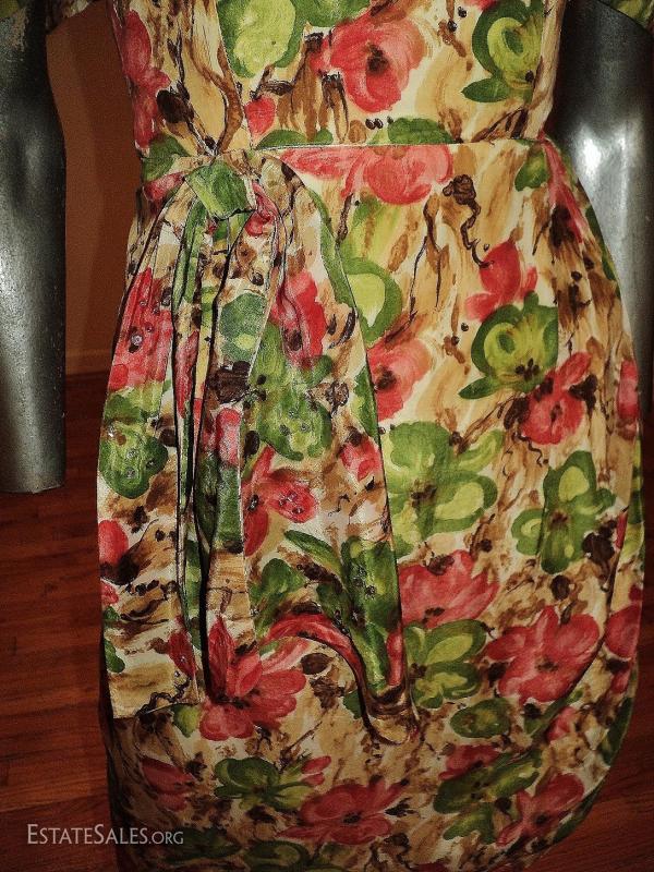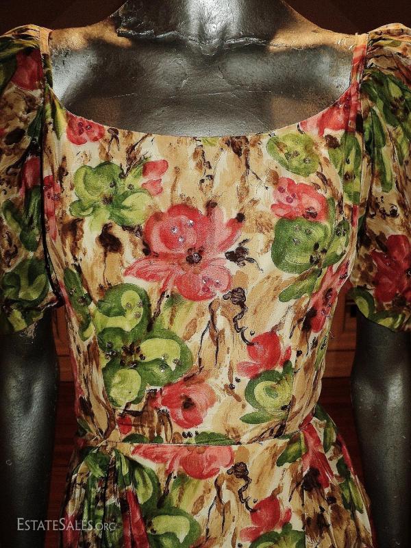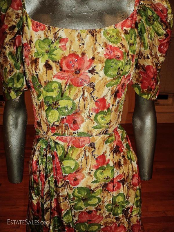 A real beauty from the 1950's all hand painted floral print with sequins and beads at the bodice and side tie