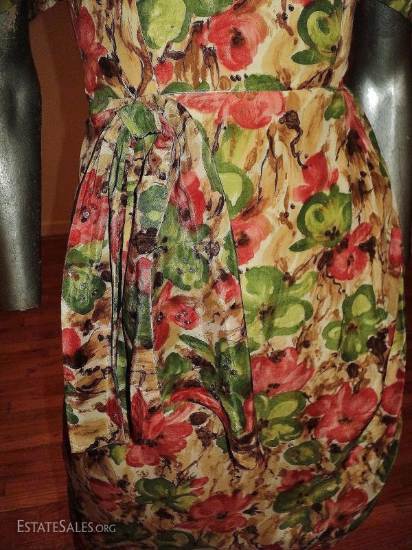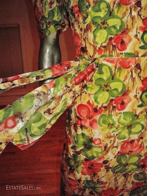 Vtg painted print wiggle beaded sequin semi wrap dress side tie