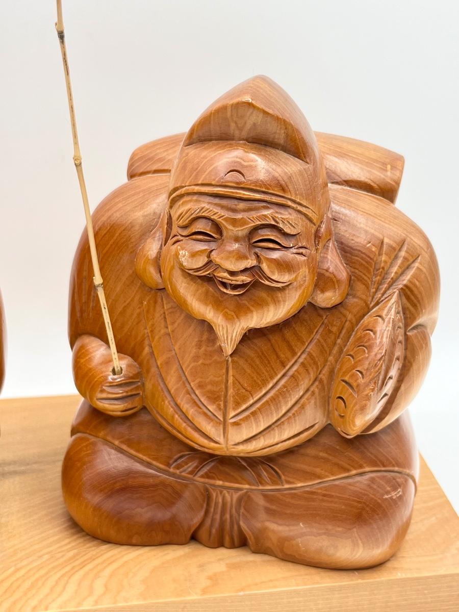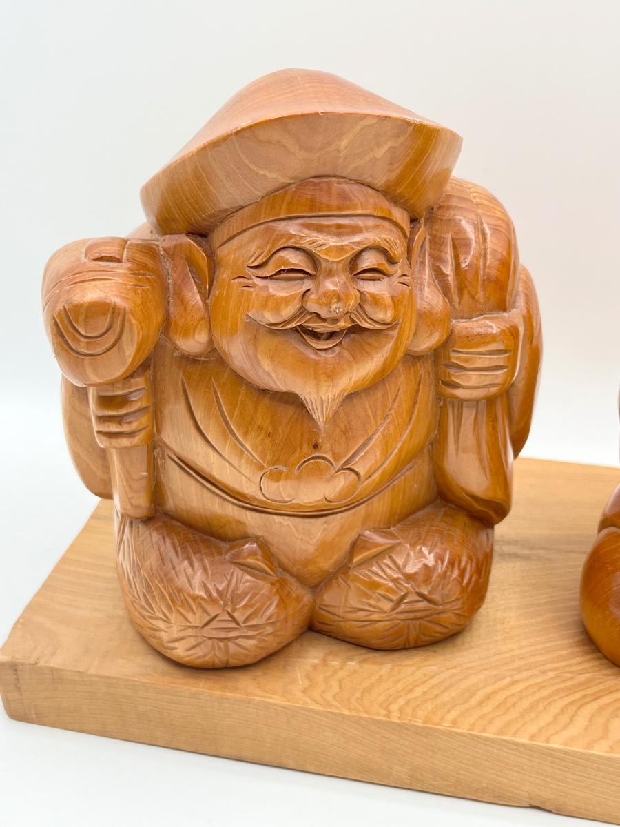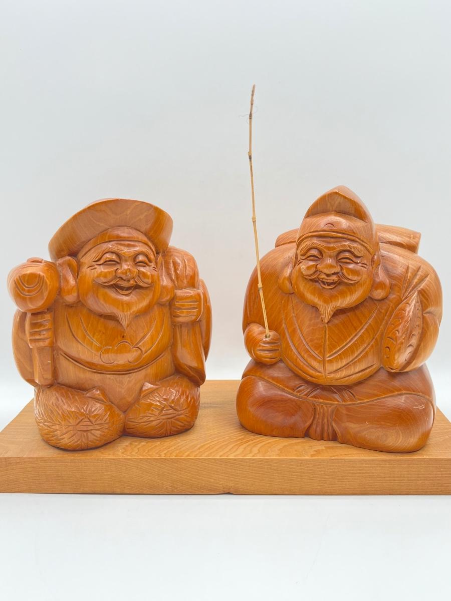Vtg. Pair (2) Japanese Hand Carved Wooden Statues ~ (7 Lucky Gods) Ebisu & Daikoku