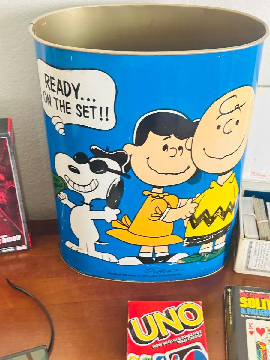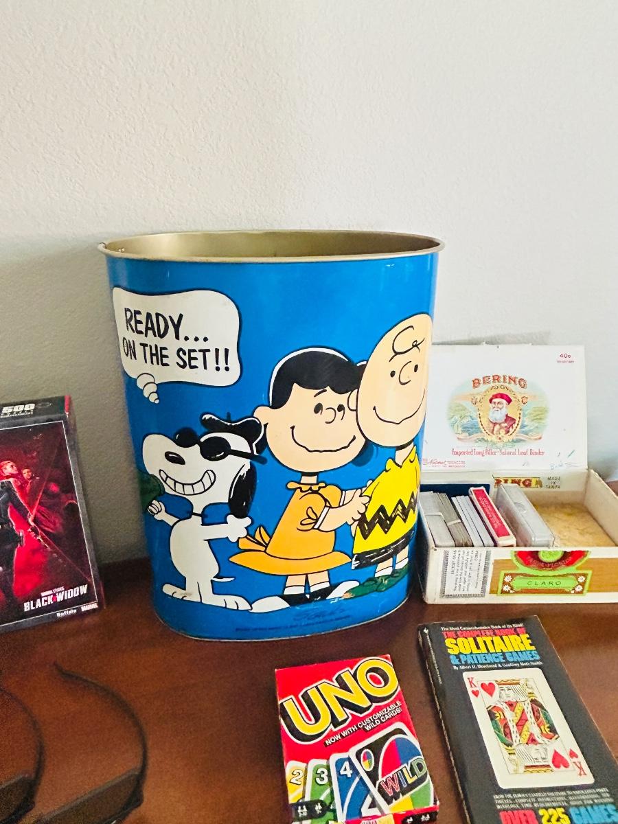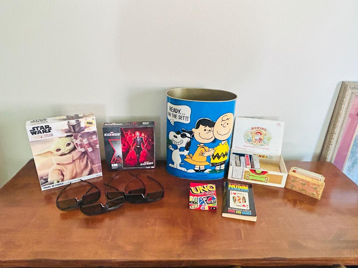 VTG PEANUTS TRASH CAN, SAMSUNG 3D ACTIVE GLASSES, PLAYING CARDS AND PUZZLES
