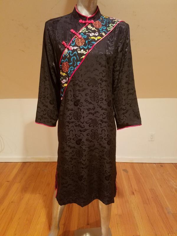 Peony silk Jacquard black Macao shift dress. Red piping satin trims. Mandarin collar and