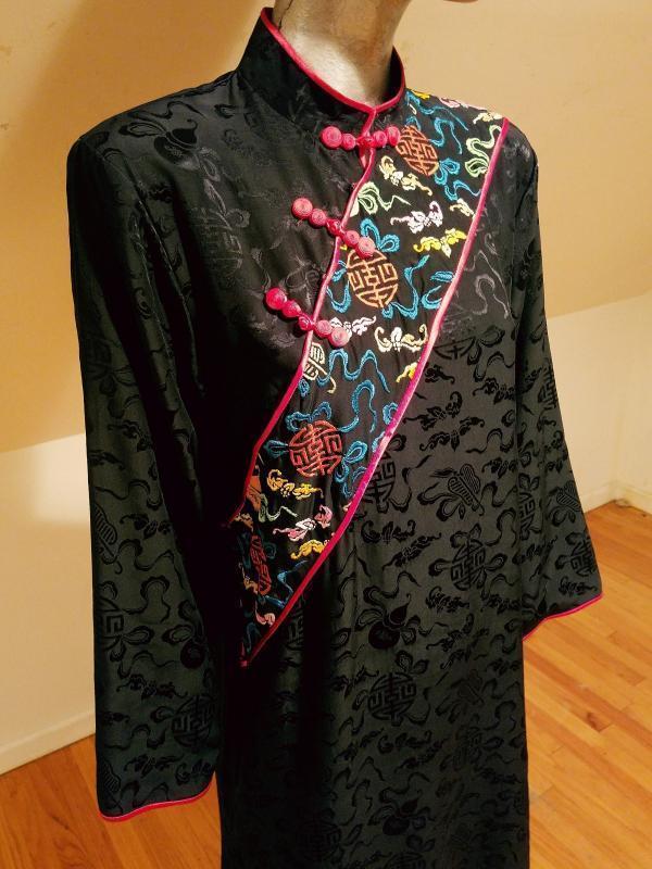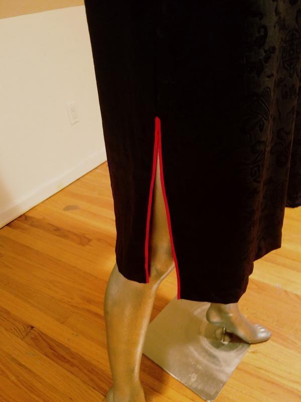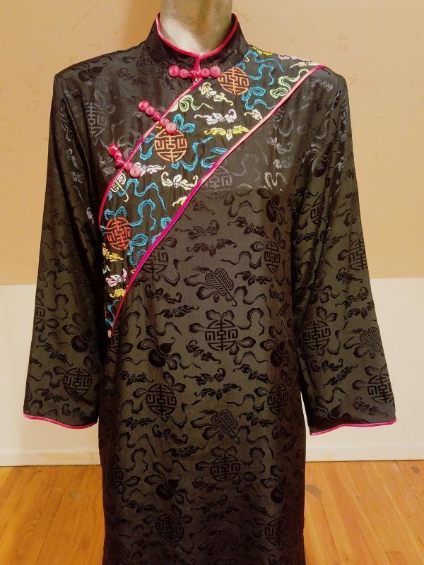Peony silk Jacquard black Macao shift dress. Red piping satin trims. Mandarin collar and