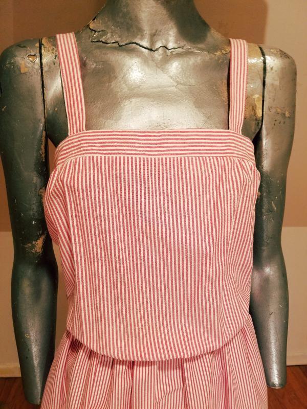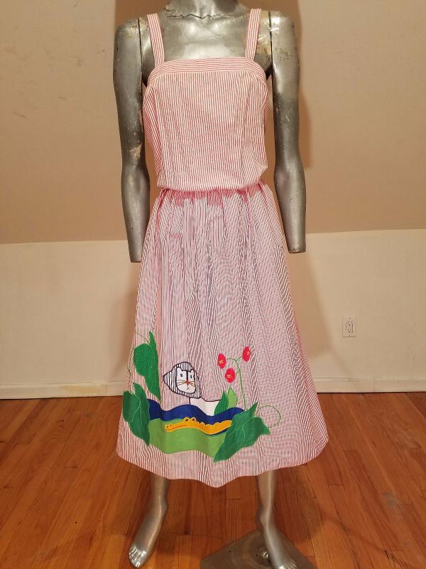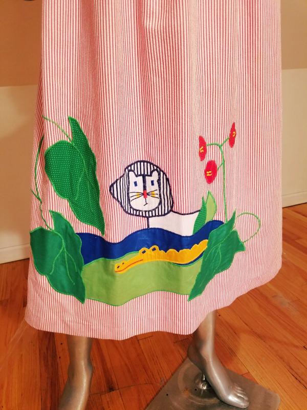 What a beauty this one is in cotton red/white seersucker stripes and animal zoo embroidered brushed cotton applique' In perfect condition from the late 1960's early 1970's