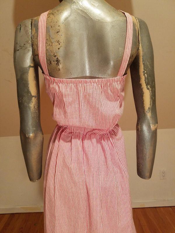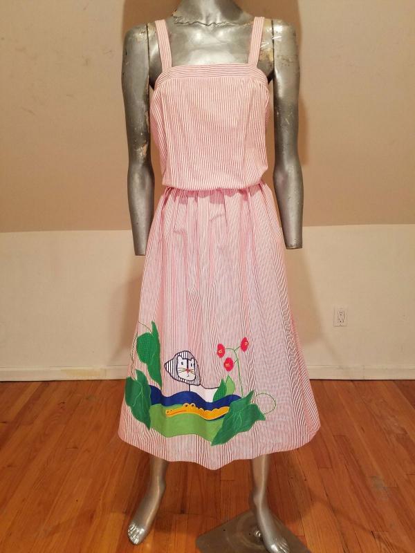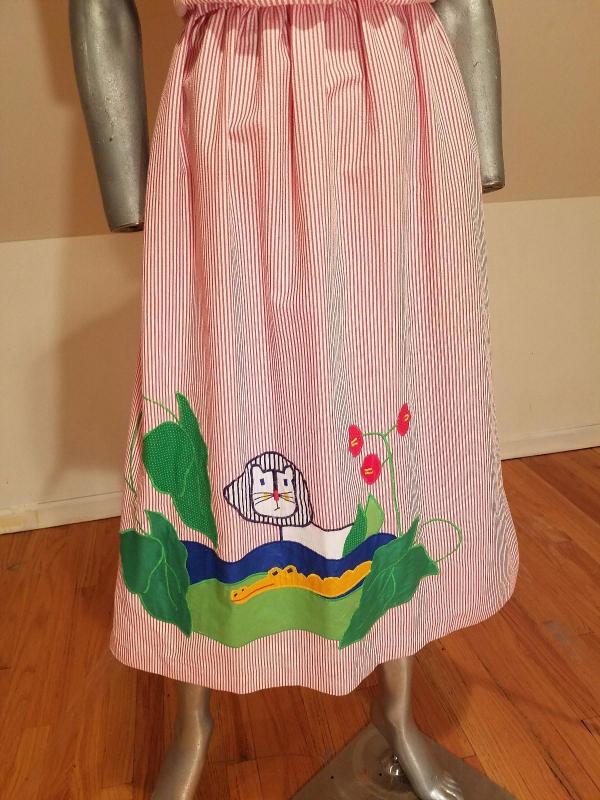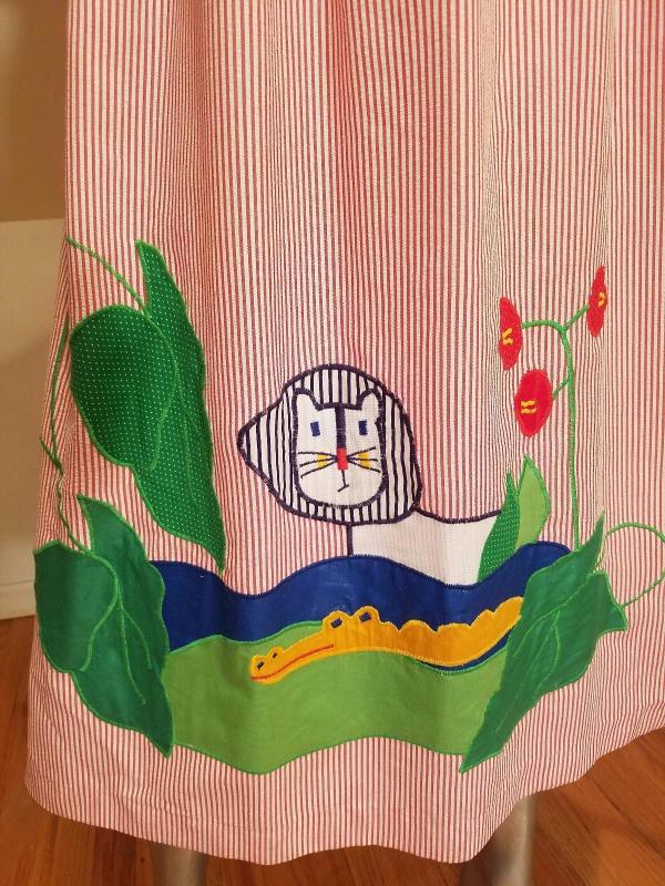 What a beauty this one is in cotton red/white seersucker stripes and animal zoo embroidered brushed cotton applique' In perfect condition from the late 1960's early 1970's