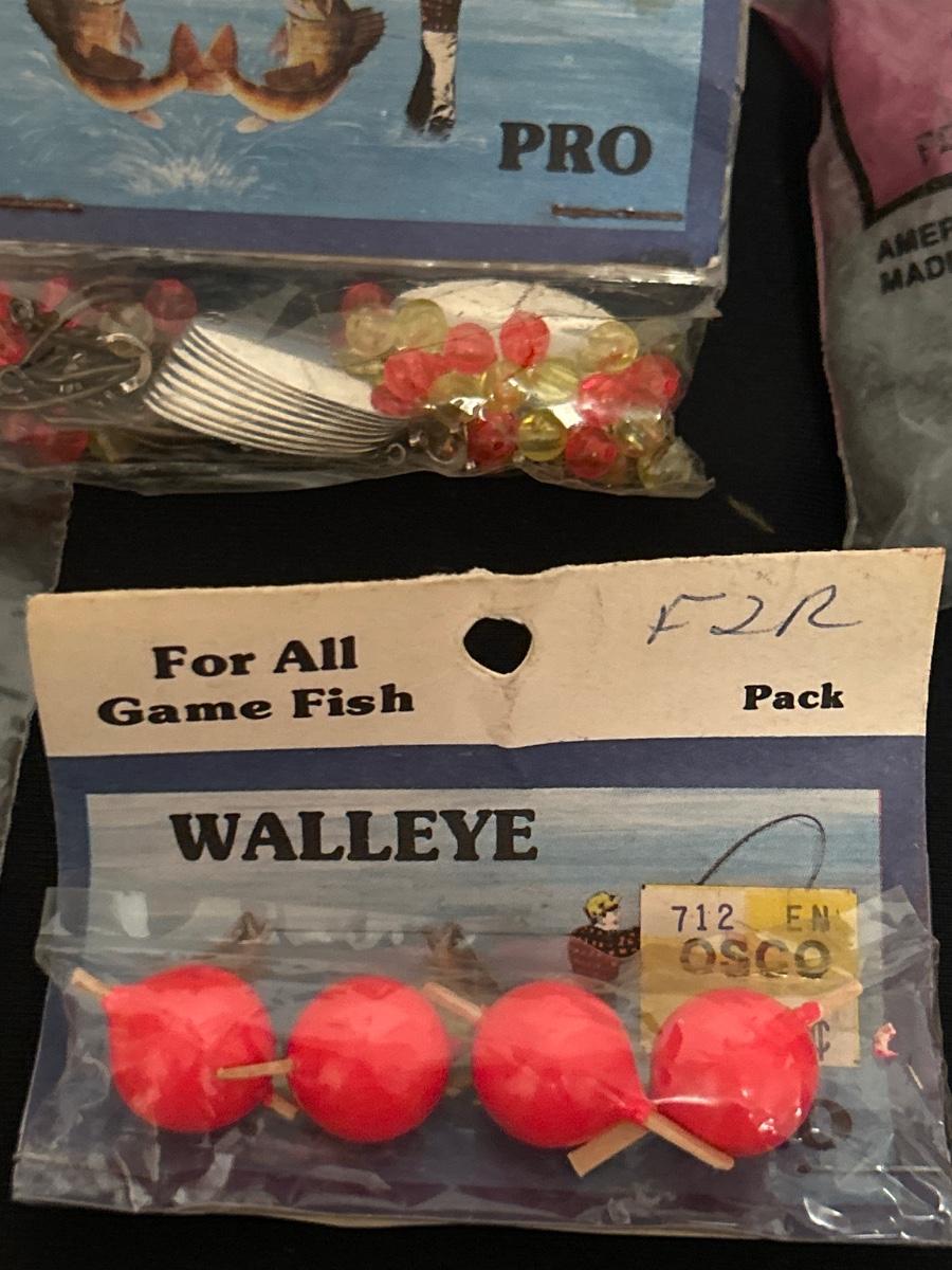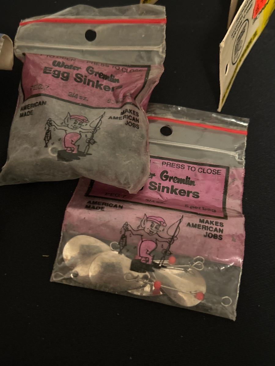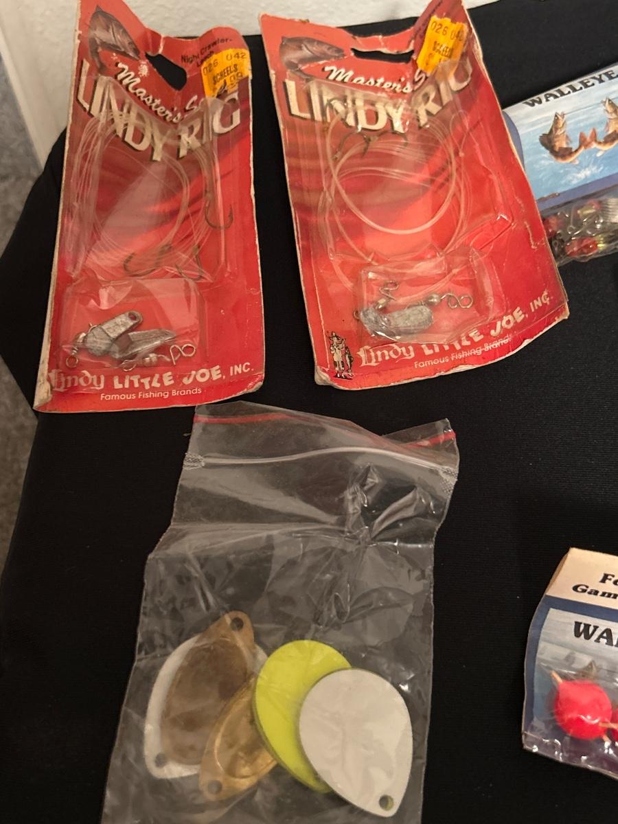Lots of vintage still in the packaging spinners, sinkers, Rigs, Mister Twister. Lures of many sizes, colors, even FEATHERS!! & jigs etc. lure on the left says “Natural Ike”, other is unbranded.