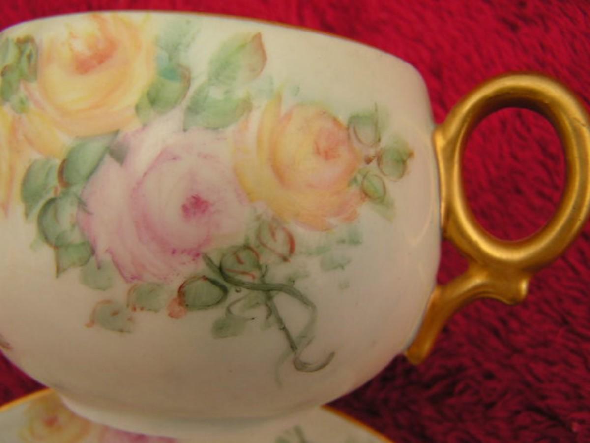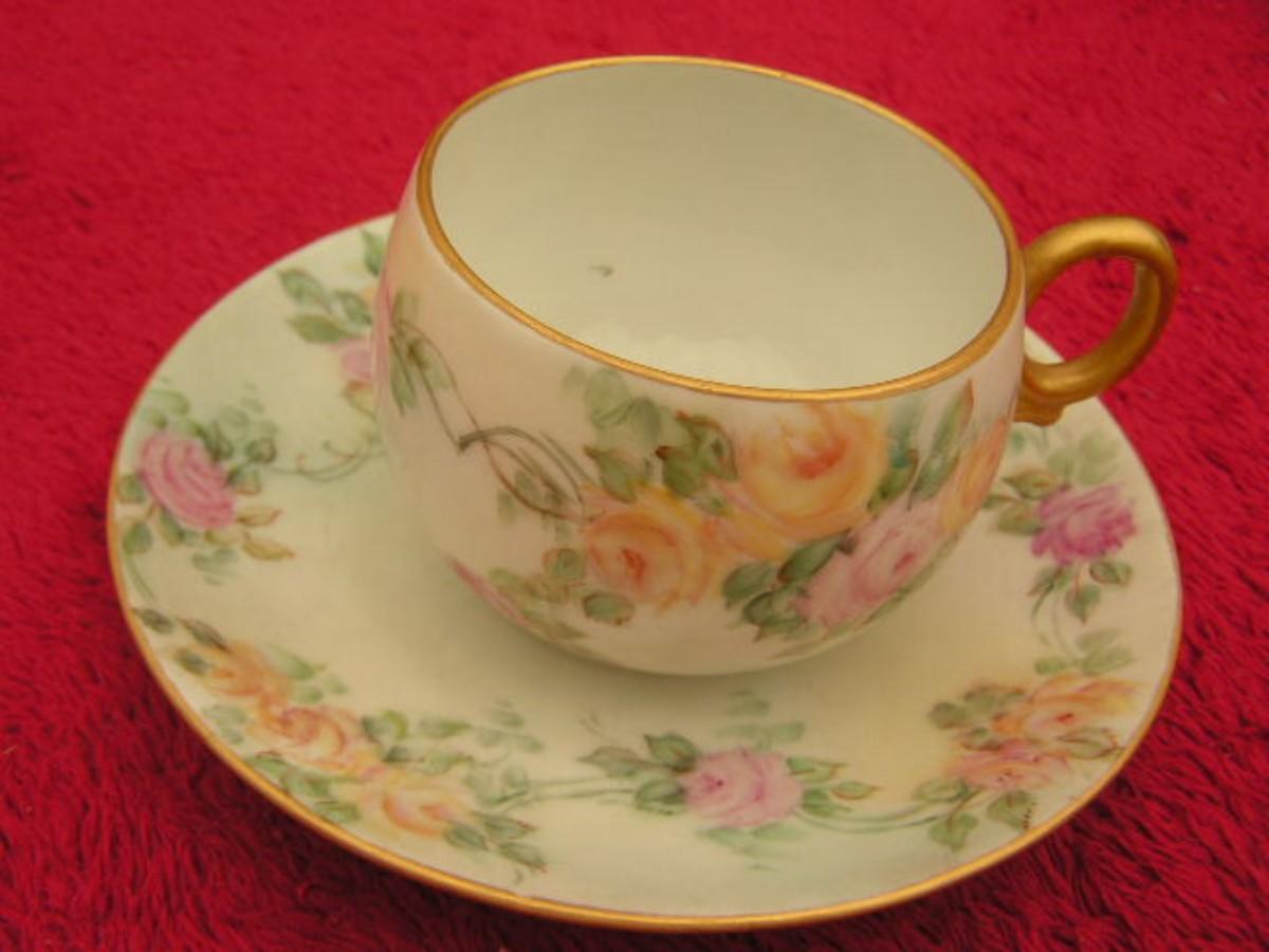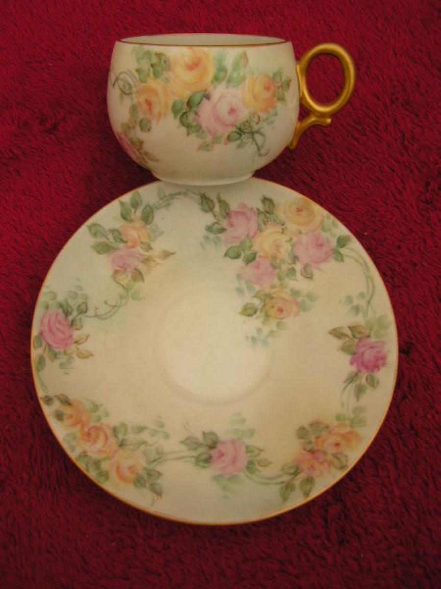 Vtg porcelain cup/saucer set w/roses&gold trim likely European 1950s.