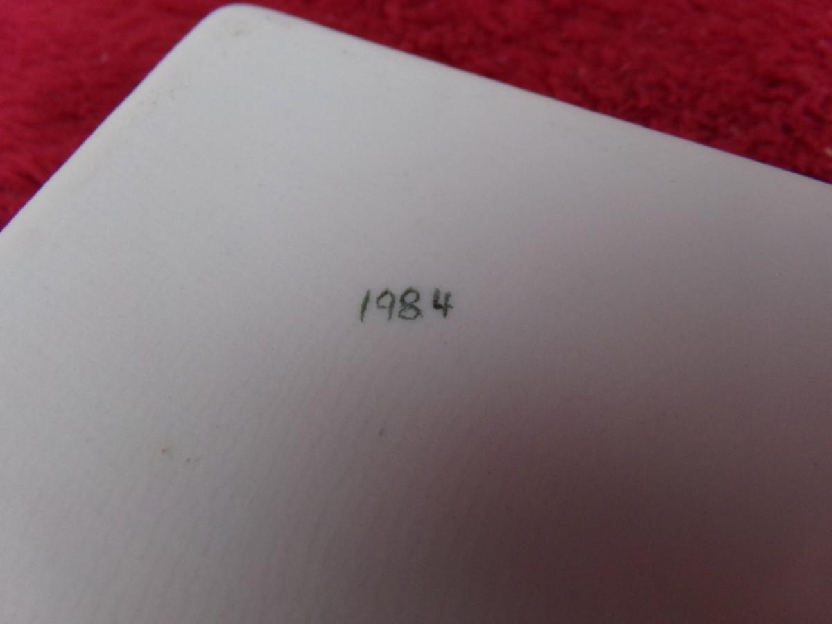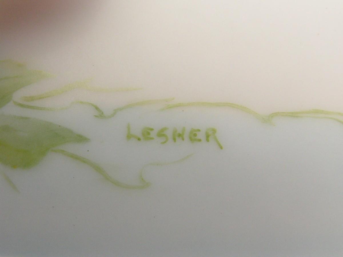 VTG post modern open butter server. Glazed ceramic and hand painted. Signed on face “LESHER”. Delicate pastel floral motifs. No apparent scratches nor chips on surface. VG to EX. About 7-1/2"x4-1/4".