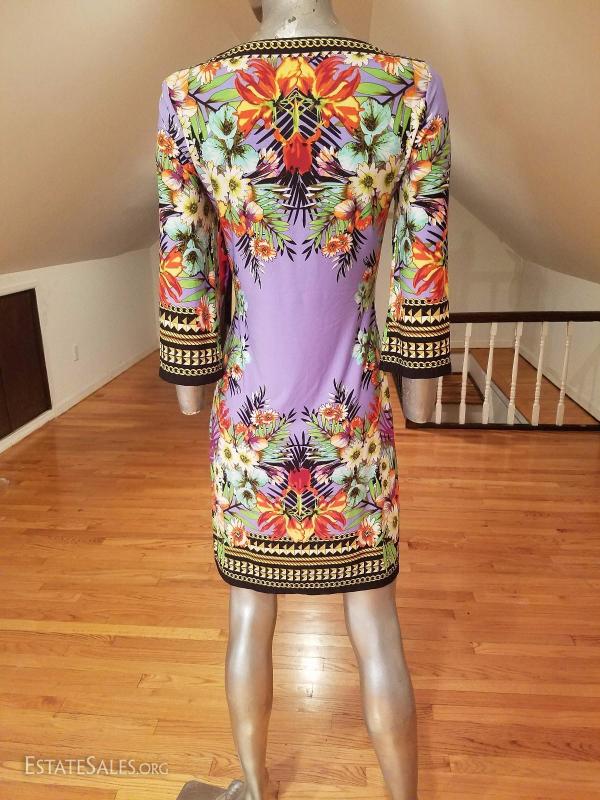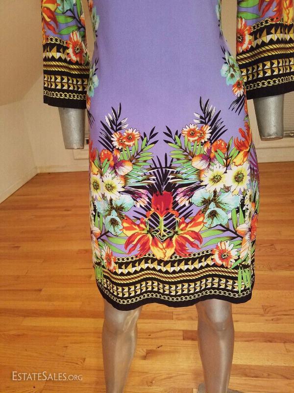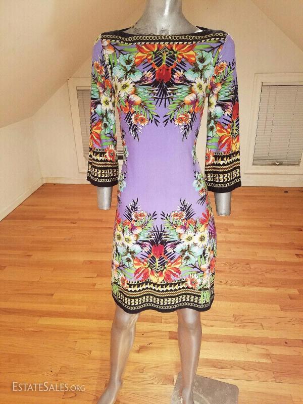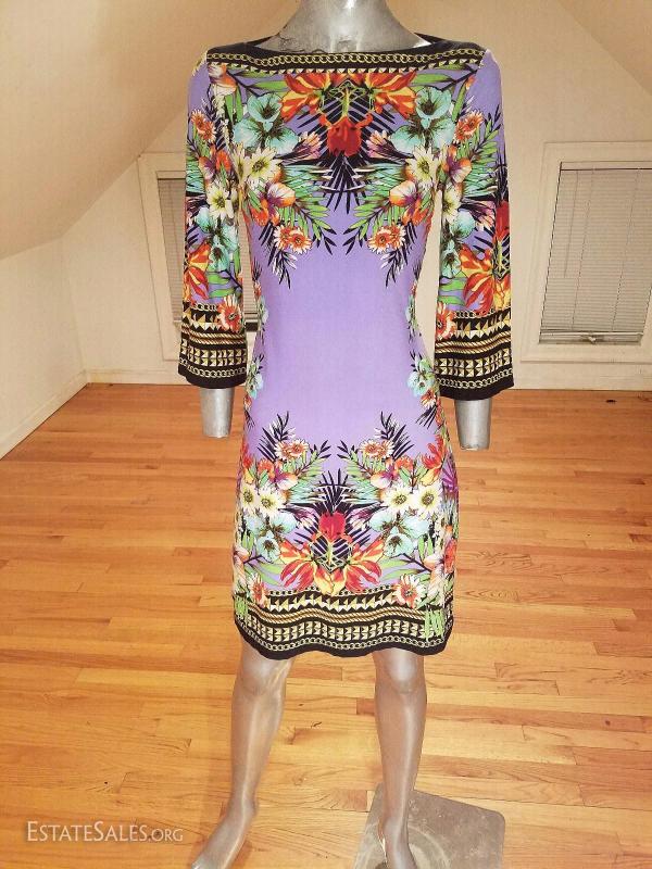 Gorgeous little dress sheath style with floral painted print on a stunning vibrant lilac background